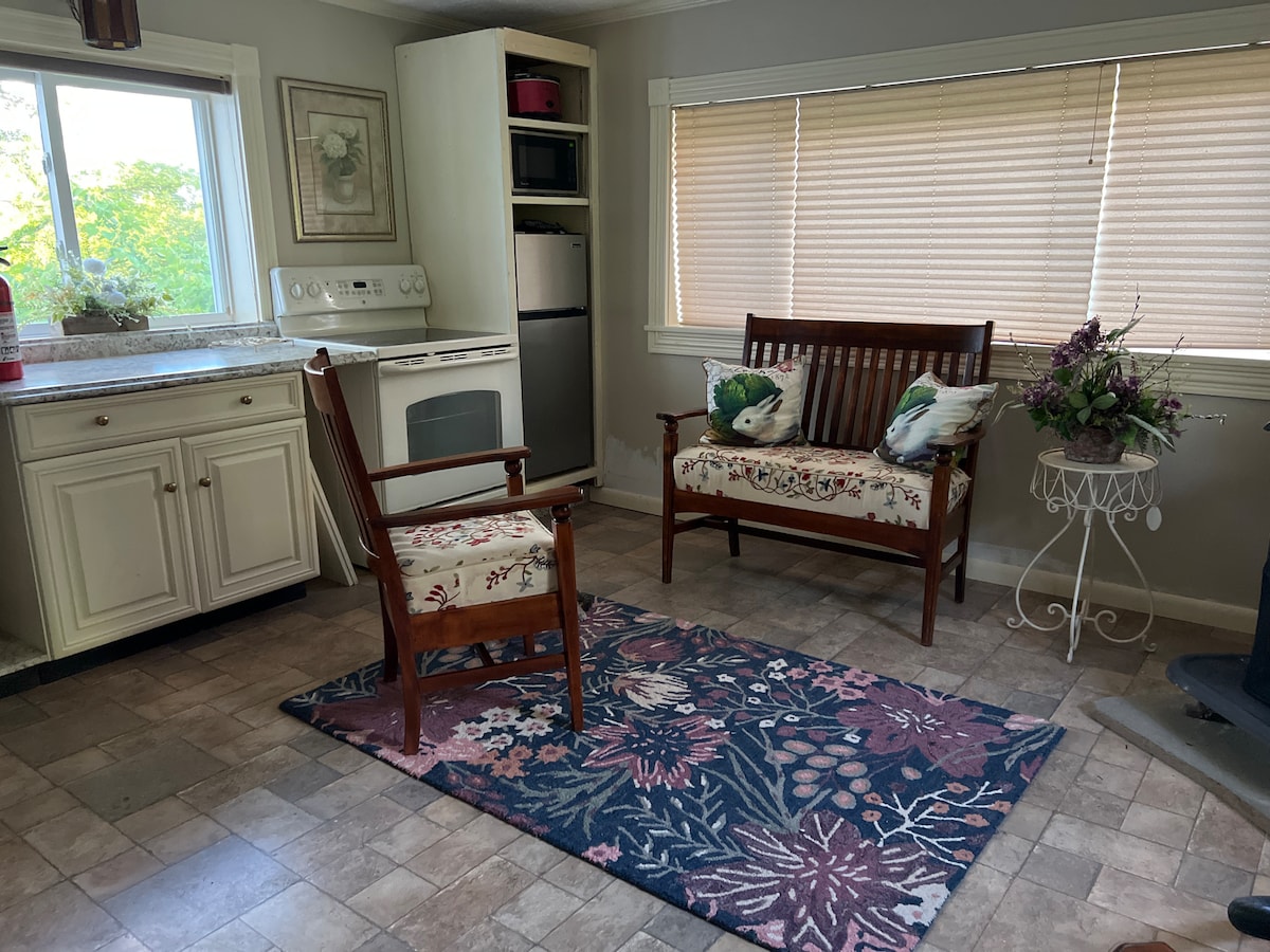 Entorno tranquilo y arbolado para una auténtica cabaña de madera: *Área boscosa autónoma. Los propietarios viven cerca. Otros alojamientos visibles en invierno. *Un camino de tierra de 1/2 milla pasa por las casas de camino a la cabaña. ¡Por favor, conduce despacio! * Señales a lo largo de la carretera cuando el GPS deja de funcionar. *Gira en la zona de aparcamiento. *Baño completo *Cocina: horno de convección/ freidora de aire/ microondas, Keurig, tostadora, frigorífico debajo del mostrador/congelador pequeño. *Cama loft queen *Doble futón *Ollas, sartenes, utensilios *Servicio de mesa para 4 *Juegos, libros