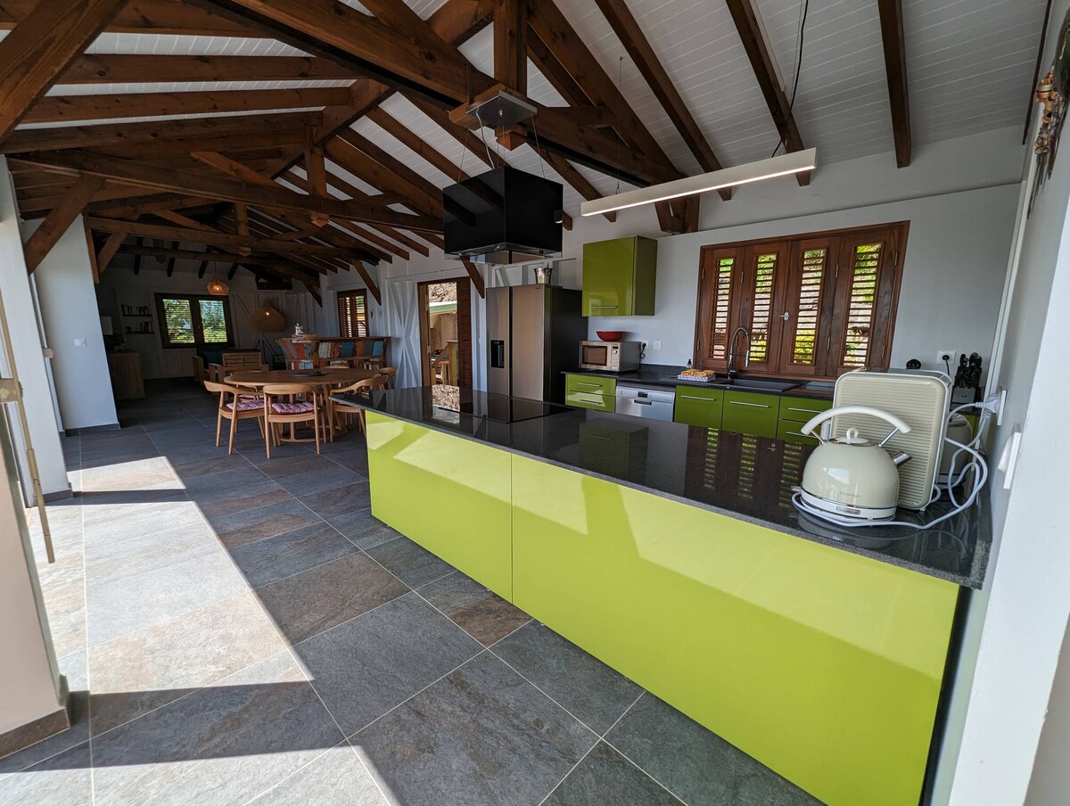 Maison , vue 180° sur mer des Caraïbes. Plage a 50 mètres. Cuisine toute équipée (plaque, micro-ondes, lave vaisselle, lave linge etc...), air conditionné dans les chambres, grande véranda de 50m2. Bar ouvert sur véranda. Deck avec solarium et barbecue. Chambres spacieuses avec rangements. 2 salles de bains, 2 WC. Salon et espace repas sur véranda. Wifi gratuit (fibre) Proximité route passante occasionnant en journée du bruit de voitures . Cet inconvénient disparaissant le soir et la nuit.