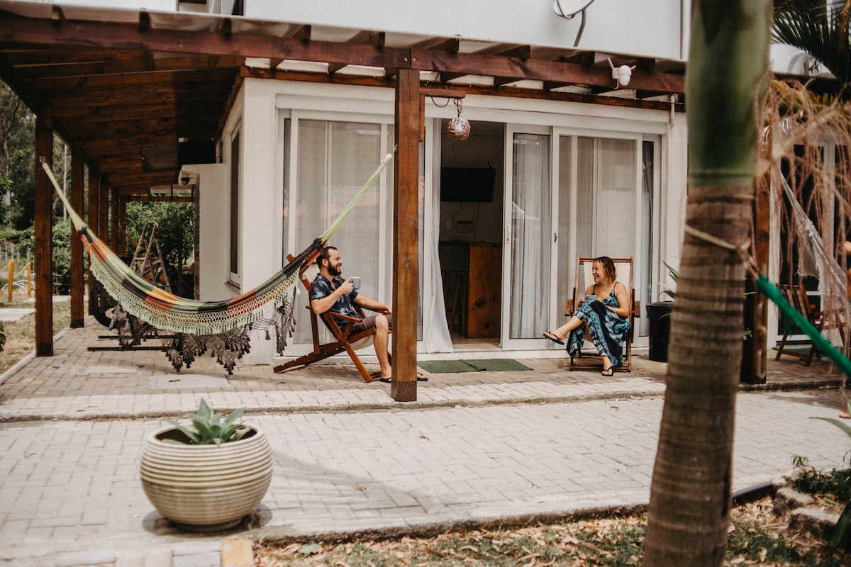 Este lugar único tiene su propio estilo. Amplio jardín, espacio para meditar, leer, hacer yoga, relajarse en la redoma escuchando a los pájaros, disfrutar de una hermosa puesta de sol. Esta casa tipo estudio fue planificada para traer el verde del jardín a su interior, con grandes ventanales. Este espacio busca ofrecer comodidad y calidez.