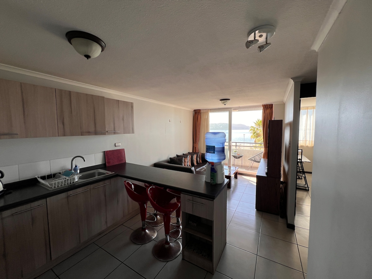 Departamento con vista inmejorable a las mejores y más populares playas de la IV° Región, equipado para vacacionar y teletrabajar. Está ubicado a 5 minutos del Casino Enjoy y totalmente equipado para que tengas la más grata estadía. Cuenta con Wifi fibra óptica de 300 Mbps, TV Cable y Televisores con Smart TV para que puedas usar Netflix o la APP que más te acomode. Ideal para pasar vacaciones, fin de semanas y teletrabajar, ya que el edificio es muy tranquilo. Incluye sábanas y toallas para 4.