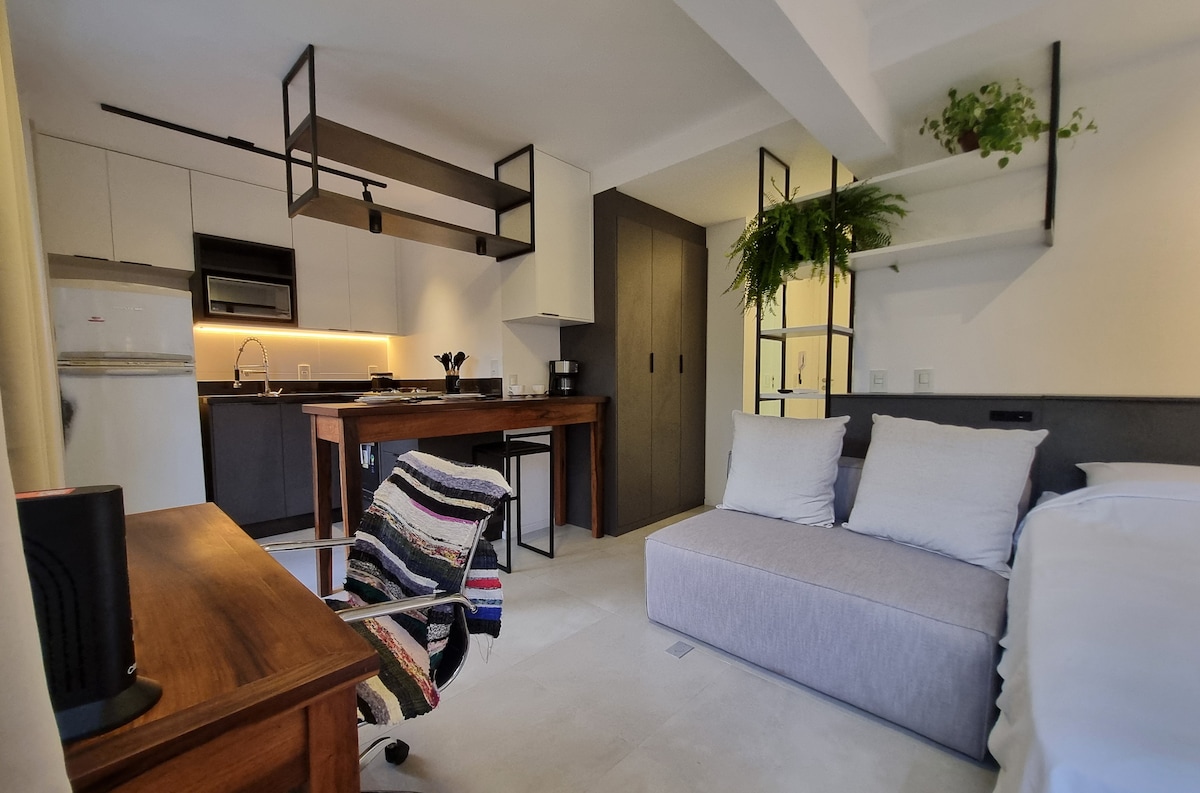 Estudio bien ventilado y cómodo, tranquilo, ideal para trabajar desde casa, aire acondicionado frío/calor, pasear y estar en la región central de Floripa, de camino a las mejores playas. Escritorio y silla de oficina, cocina, baño. Hay otros espacios compartidos para practicar yoga (espacio Casa Aflorar), vistas privilegiadas de Beiramar y la región, rodeado de vegetación nativa y jardines. Internet de fibra, freidora de aire, cortinas opacas. Culturismo cerca, carriles bici.
