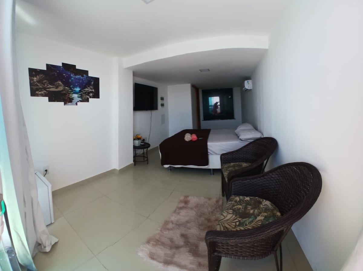 Piso con sala, dormitorio, cocina, baño y balcón. Aire acondicionado en todo el apartamento (2 splits), 2 televisores inteligentes (sala de estar de 40") y cocina con utensilios. Se ofrecen ropa de cama y de baño. El condominio cuenta con piscina, sauna, hidromasaje y gimnasio a disposición del huésped sin necesidad de certificado médico. Recepción 24 horas, ¡puedes entrar en cualquier momento! Almacenamiento diario, wifi y aparcamiento incluidos. Edificio accesible, ascensor, lavandería, minimercado, auditorio y El restaurante con todas las comidas.