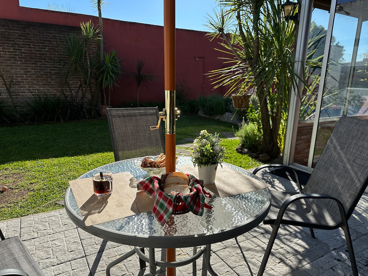 Habitación privada da al patio, jardín y piscina