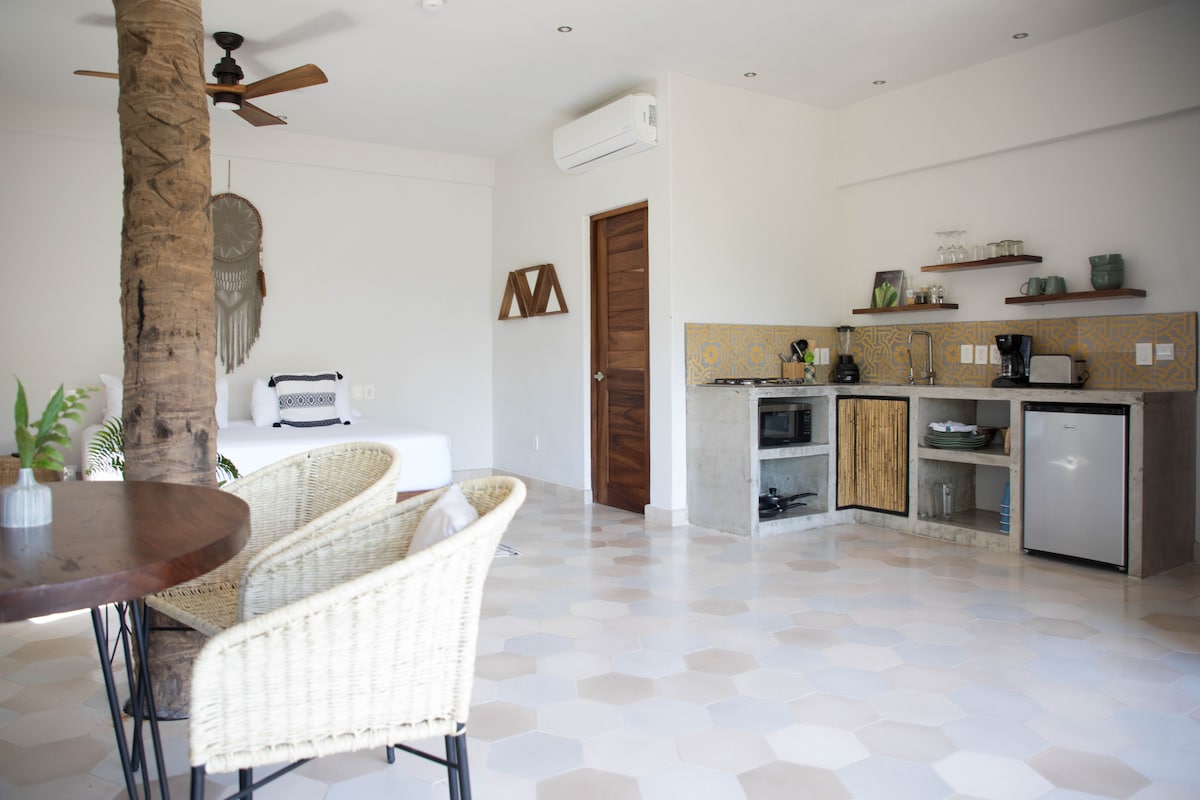 Estudio premium estilo Wabi-Sabi para hasta 4 huéspedes. Cuenta con cama king size y sofá cama queen, TV, aire acondicionado y ropa de cama completa para el sofá. Nuestro estudio Gordo incluye cocina equipada con utensilios básicos, refrigerador, estufa y licuadora. Baño privado con toallas y amenidades, además de una terraza ideal para relajarse. Con 48 m², el estudio se encuentra en el tercer nivel del edificio.