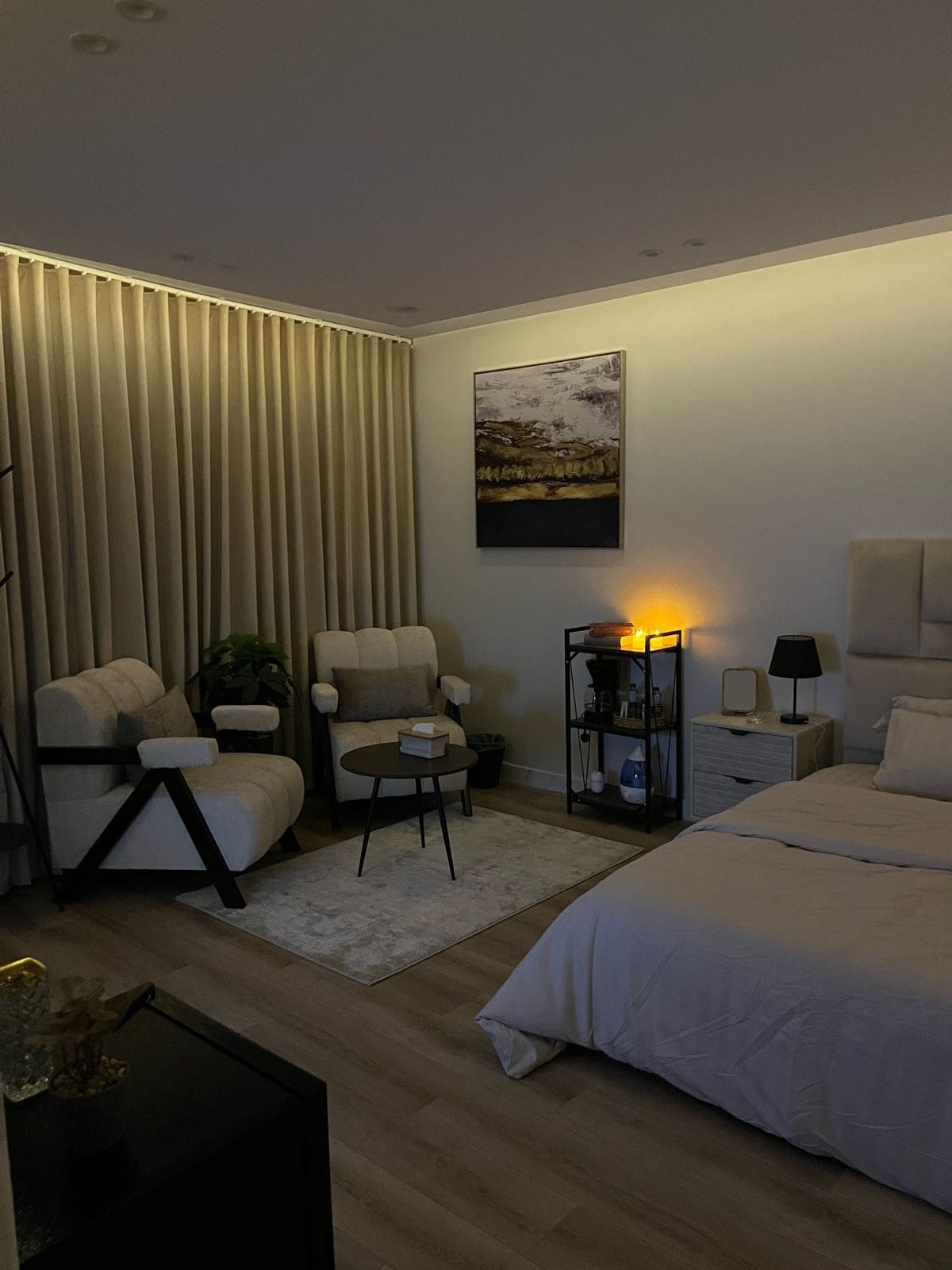 Un apartamento de hotel que consta de una sala de estar, un dormitorio y Cocina totalmente equipada con todos los utensilios de cocina. Internet rápido para el apartamento y una pantalla inteligente de 75 pulgadas. Tiene una cuenta Shahid y Ossen + Hay una zona de trabajo y una zona de café con capacidad para cuatro personas. El apartamento está en la planta baja y hay aislamiento acústico en las puertas. Autobloqueo de la puerta del apartamento, así como de la puerta del edificio Cerca de los eventos de la temporada de Riad Las instalaciones públicas externas están vigiladas por cámaras de seguridad para garantizar la seguridad y la privacidad. Hay un estacionamiento privado delante del edificio. Un lugar tranquilo cerca de todos los servicios. Ofrecemos servicio de limpieza diario y se pueden añadir colchones bajo petición.