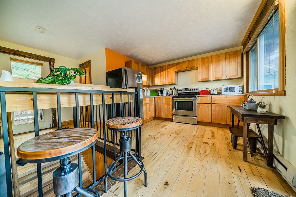 Relájate en una bañera de hidromasaje frente al río en este acogedor apartamento de 1 dormitorio en la orilla de Fall River, a pocos minutos de RMNP y del centro de Estes, ¡permiso 6227! Esta escapada de montaña perfecta combina el confort moderno con unas vistas impresionantes. + Bañera de hidromasaje privada con vistas al río + Cama king + chimenea para mayor comodidad + Cocina completa con granito y acero inoxidable + Ducha a ras de suelo y bidé + Trucha de agua dulce en verano Un campamento base perfecto para dos personas para explorar el Parque Nacional de las Montañas Rocosas.