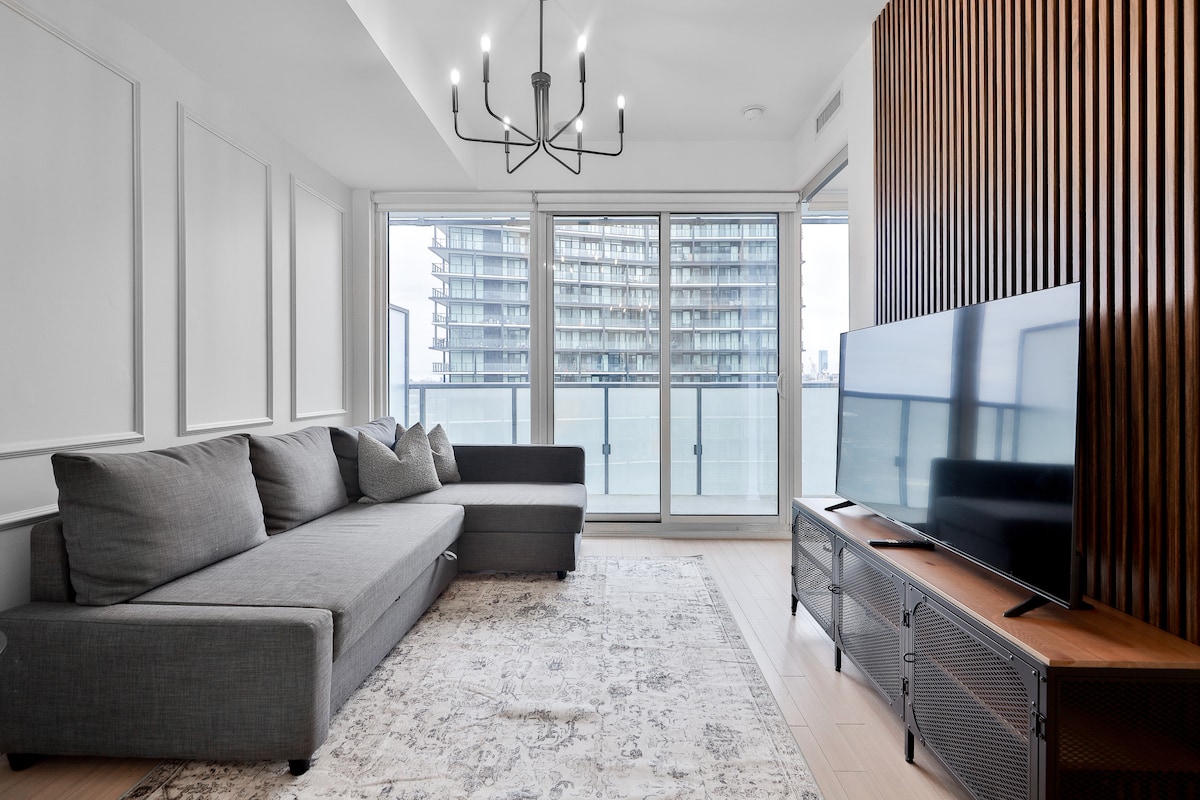 Perfecto para parejas, viajeros de negocios, familias y grupos pequeños. ✨ El espacio • Hermosas vistas al lago desde la unidad • 1 cómodo dormitorio con Smart TV • Amplio salón con sofá cama para 2 personas. • Segundo televisor en la sala de estar. • Cocina totalmente equipada • Wifi de alta velocidad. • Ropa de cama y toallas frescas y de calidad hotelera • Lavadora y secadora en la habitación • Limpieza profesional antes de cada estancia Ubicación 🏙 inmejorable • A 2 minutos a pie del tren del aeropuerto de Union Station: UP Express, Torre CN y Rogers Arena