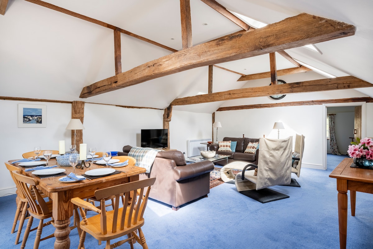 Ubicada en los hermosos terrenos de una casa del salón Wealden del siglo XV, The Stables es una encantadora casa de campo enmarcada de roble, un refugio escondido y tranquilo para dos. Hay una sala de estar con estufa de leña para noches súper acogedoras, y el bonito dormitorio tiene una lujosa cama tamaño king de 4000 muelles de bolsillo y ropa de cama de algodón egipcio de calidad. En el exterior hay un jardín aislado con una terraza y setenta acres de bosque y pastos para pasear; ¡nuestros labradores residentes estarán encantados de acompañarte!