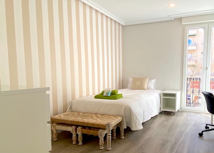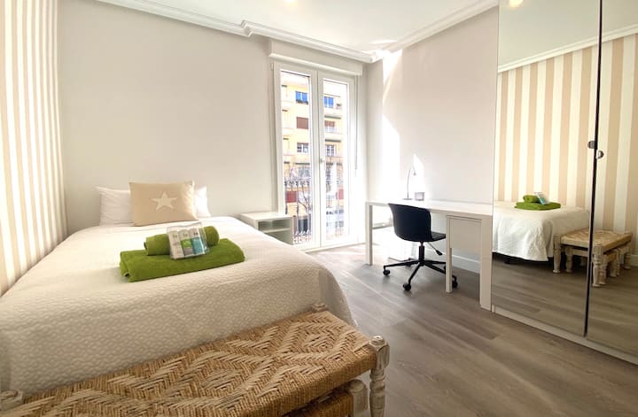 Pensada para dar respuesta al bienestar y la comodidad, la habitación Superior dispone de balcón exterior a Guzmán el Bueno ademas de todas las comodidades para hallar en sus 10 m² el perfecto equilibrio entre el descanso y el trabajo. La pieza clave es su amplitud y cama de 105 cm. Además dispone de un baño bien equipado a compartir con una persona.