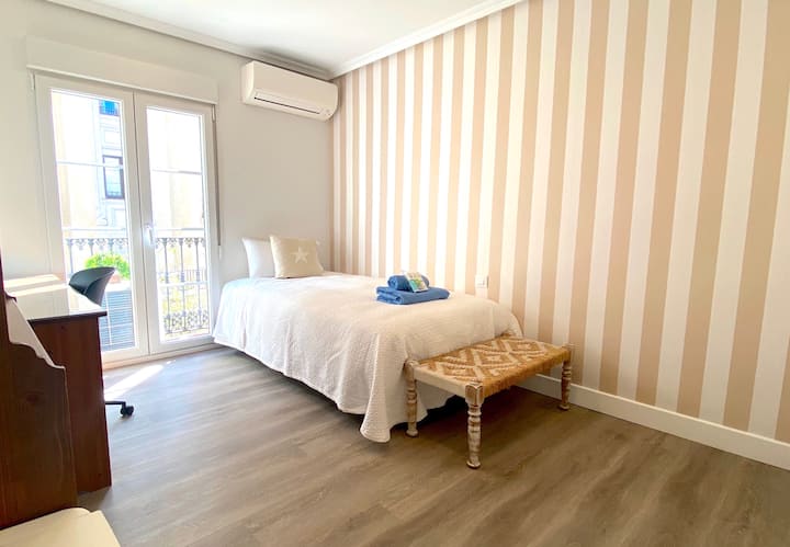 Espaciosa y muy luminosa habitación exterior con balcón a Donoso Cortes. Dispone de todas las comodidades para hallar en sus 12 m² un perfecto equilibrio entre bienestar y tranquilidad. La pieza clave es su cama de 105 cm. y sus 2 armarios empotrados.
