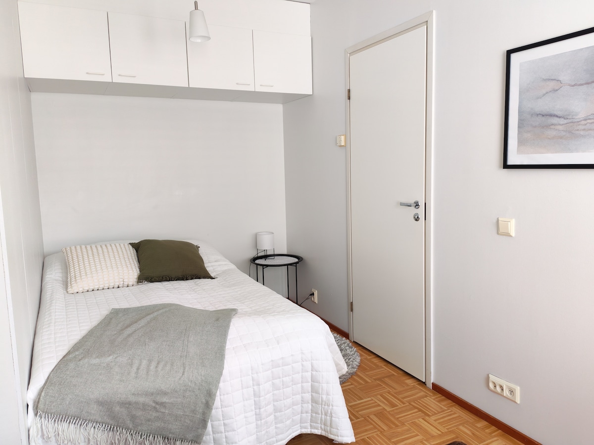 Apartamento adjunto a una casa de anfitriones. Tendrás tu propia entrada y privacidad. Tu costado tiene inodoro,ducha y sauna. No hay cocina, pero hay freidora de aire, nevera, microondas, cafetera y hervidor eléctrico, por lo que puedes preparar comidas sencillas. La sauna es de leña climatizada y se puede utilizar sin cargo. También hay posibilidad de aparcar en un garaje cálido. Ubicado a 3 km del centro de la ciudad. A unos cientos de metros hay una tienda de comestibles, una parada de autobús y una pista de esquí. Puedes utilizar nuestro patín,esquís y trineo de forma gratuita.