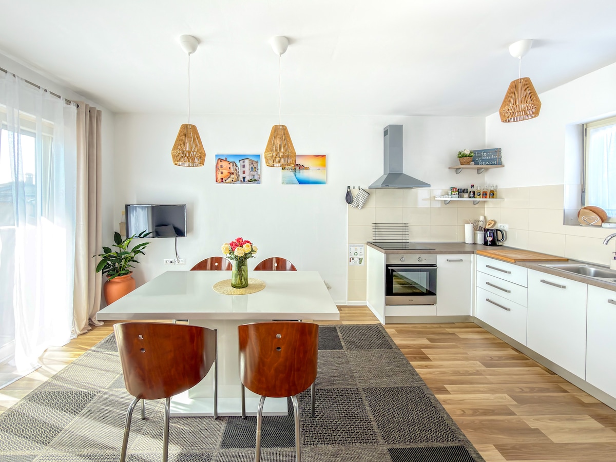 Alojamiento único decorado con un estilo inusual. Alquilas un apartamento en una casa familiar, pero tendrás el ambiente como si alquilaras una casa de campo, porque dentro del edificio tienes una terraza con una barbacoa al aire libre y una plaza de aparcamiento privada, y todo esto solo para ti. El apartamento está situado en una zona tranquila cerca de la ciudad de Novigrad, que ofrece un ambiente único para pasear por el mar y las antiguas murallas de la ciudad e Istralandia, el parque acuático más grande de la UE. También tienes bicicletas y una gran televisión con Netflix.