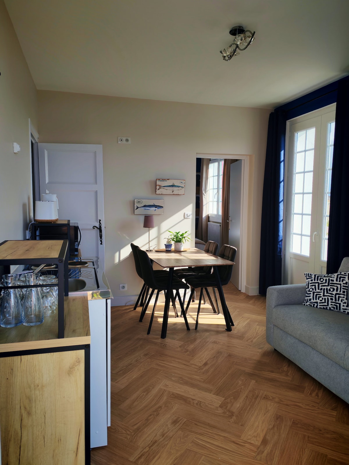 Magnífico apartamento con vistas al mar de 180°, bañado por el sol desde la mañana, salón orientado al sureste. Cerca de todos los comercios, a dos pasos del centro de la ciudad y al pie de la playa de Foncillon. Apartamento T1 de 40 m², tranquilo y con todas las comodidades, con una gran sala de estar convertible en un espacio nocturno con capacidad para 4 personas (1 cama de 160 + 2 camas de 80), una cocina independiente totalmente equipada, baño, inodoro separado y numerosos espacios de almacenamiento. +