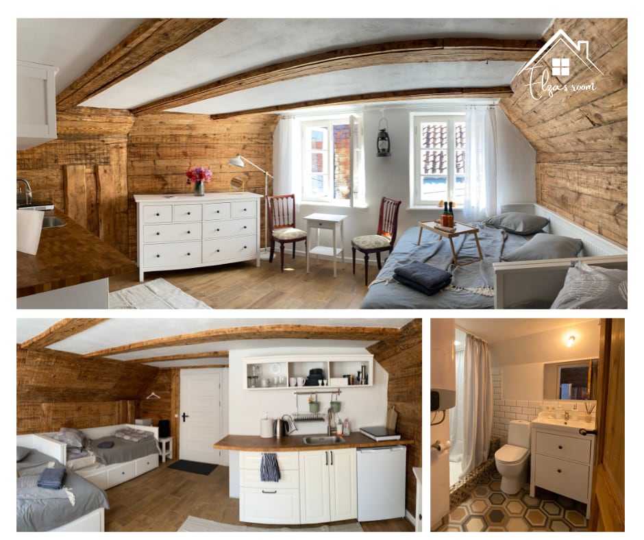Un acogedor estudio de arte en el centro del casco antiguo para una estancia creativa. Es mi estudio que me sirve a mí y a otras almas creativas durante todo el año. Tiene un inodoro y un lavabo con agua caliente en la zona común, pero NO DUCHA ni BAÑERA DE HIDROMASAJE. En verano, el río es un lugar para bañarse. En invierno o a partir del 1 de septiembre al 30 de mayo, puedes visitar el hermoso centro de piscinas y saunas de Kuldigas para nadar, disfrutar de la sauna y de una ducha caliente. Así que, en general, tienes que ser un amante de la natación. ❤️🔥🐋 El estudio tiene un gran jardín. Con mesa y sillas.
