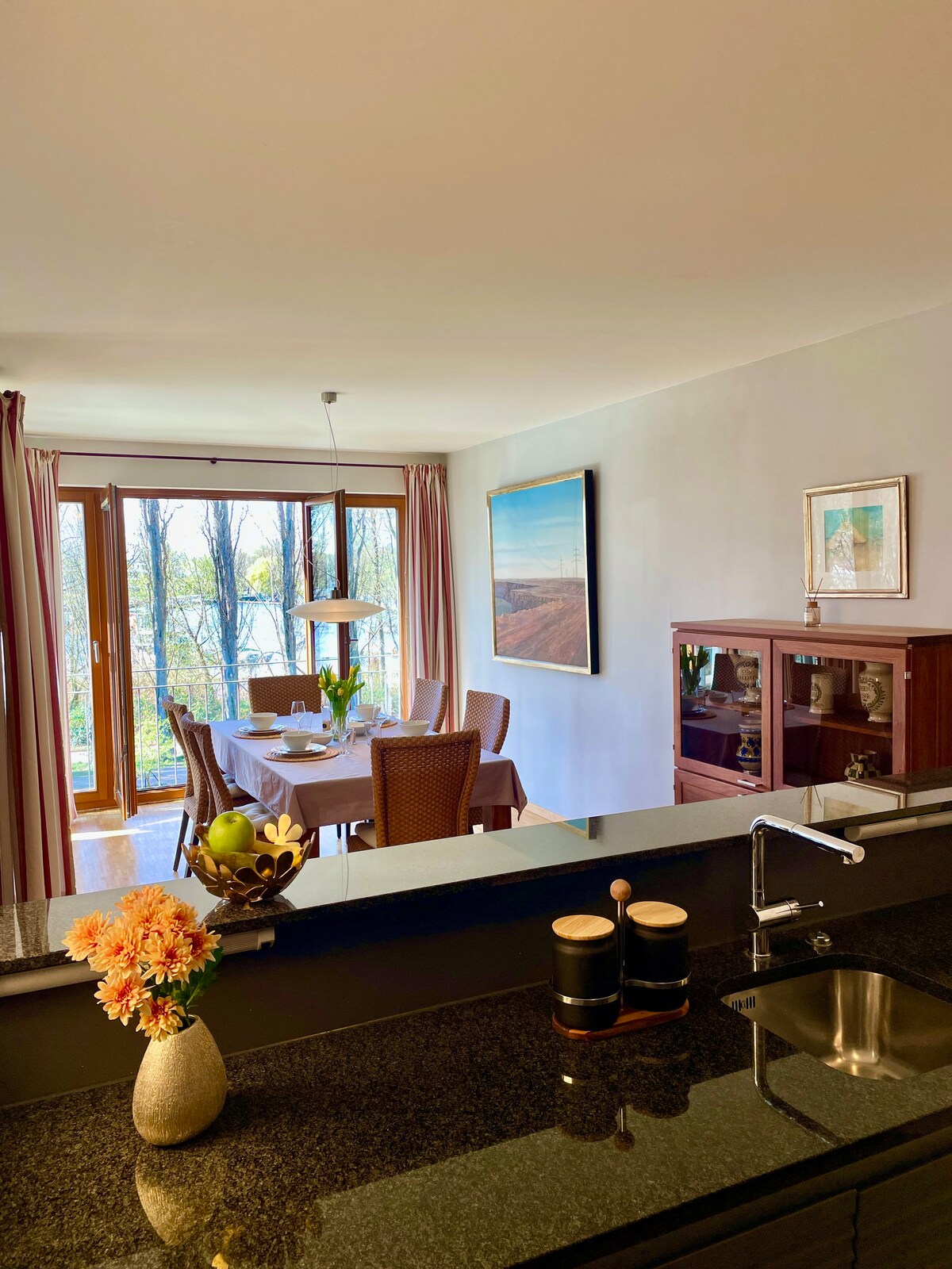 Este elegante apartamento de dos habitaciones con entrada privada es perfecto para tu viaje a Berlín y ofrece el refugio perfecto cerca de la ciudad. Friedrichshain, a 10 min., Treptow, a 15 min. y Kreuzberg, a 20 minutos a pie. Junto a la gran cocina-comedor se encuentra el dormitorio contiguo con acceso directo a la tranquila terraza (40 m²). Además, este apartamento tiene su propio baño con ducha, wifi, lavadora y secadora. Se puede reservar una plaza de aparcamiento cubierta en la casa.