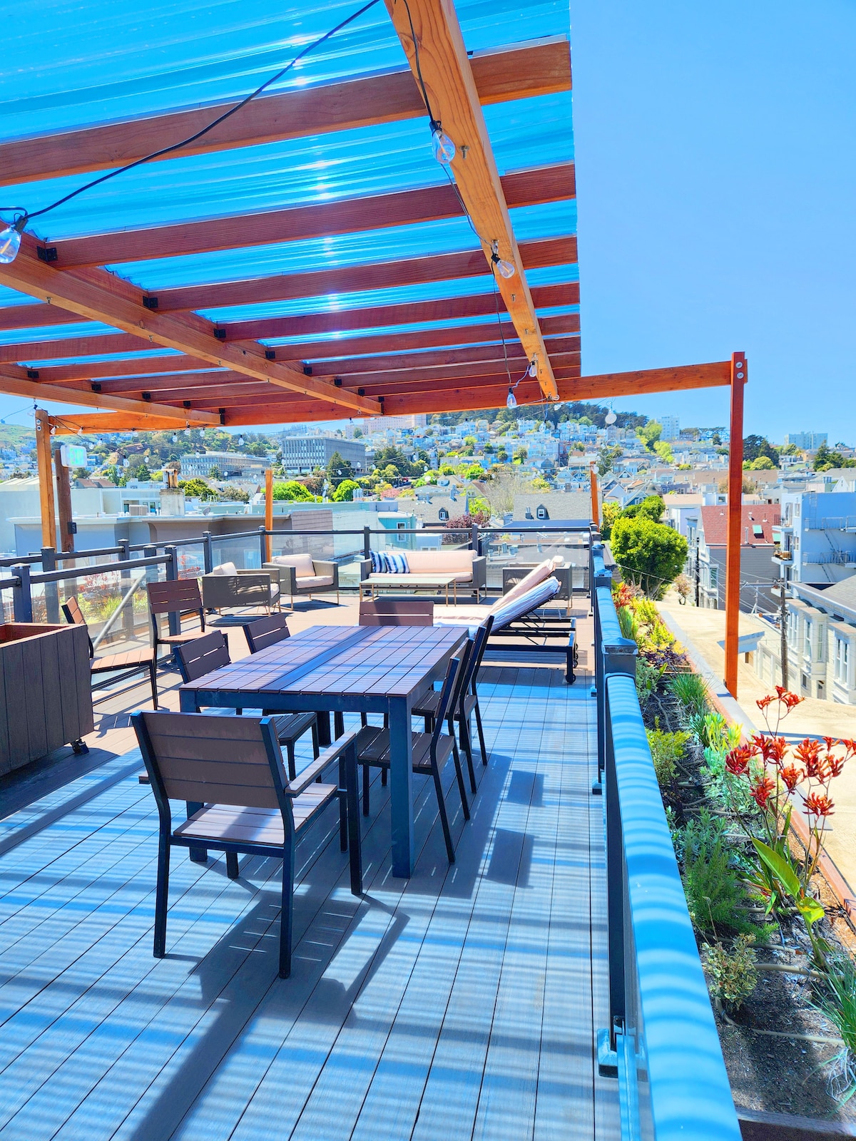 Apartamento estudio de planta abierta moderno con ubicación céntrica. Preciosas vistas desde la terraza trasera. Cocina completa, bañera con patas, chimenea al aire libre, barbacoa, 2 televisores 4K de alta definición. Una escapada romántica entre los distritos de Castro y Mission, a una manzana de Dolores Park. La línea J Church Muni pasa por delante del edificio y te lleva al centro de la ciudad en 15 minutos. Un montón de tiendas, restaurantes, bares y lugares de interés a pocos pasos de nuestra puerta. ¡MUY IMPORTANTE! Lee mi información sobre mascotas y estacionamiento antes de reservar.