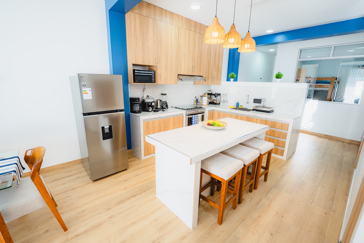 Departamento privado y exclusivo para el huésped en 2do. piso, ingreso autónomo, acogedora sala con sofá cama y Smart TV de pantalla plana; mesa con cuatro sillas; cocina moderna, aire acondicionado, dos dormitorios con cómoda cama 2 plazas, espacio para trabajo dedicado, dos baños, agua caliente, terraza interior y otra con parrilla, lavandería con lava/seca. ¡Internet, estacionamiento gratis, a 10 min del aeropuerto y 6 minutos de la plaza de armas. Tendrán una experiencia inolvidable.