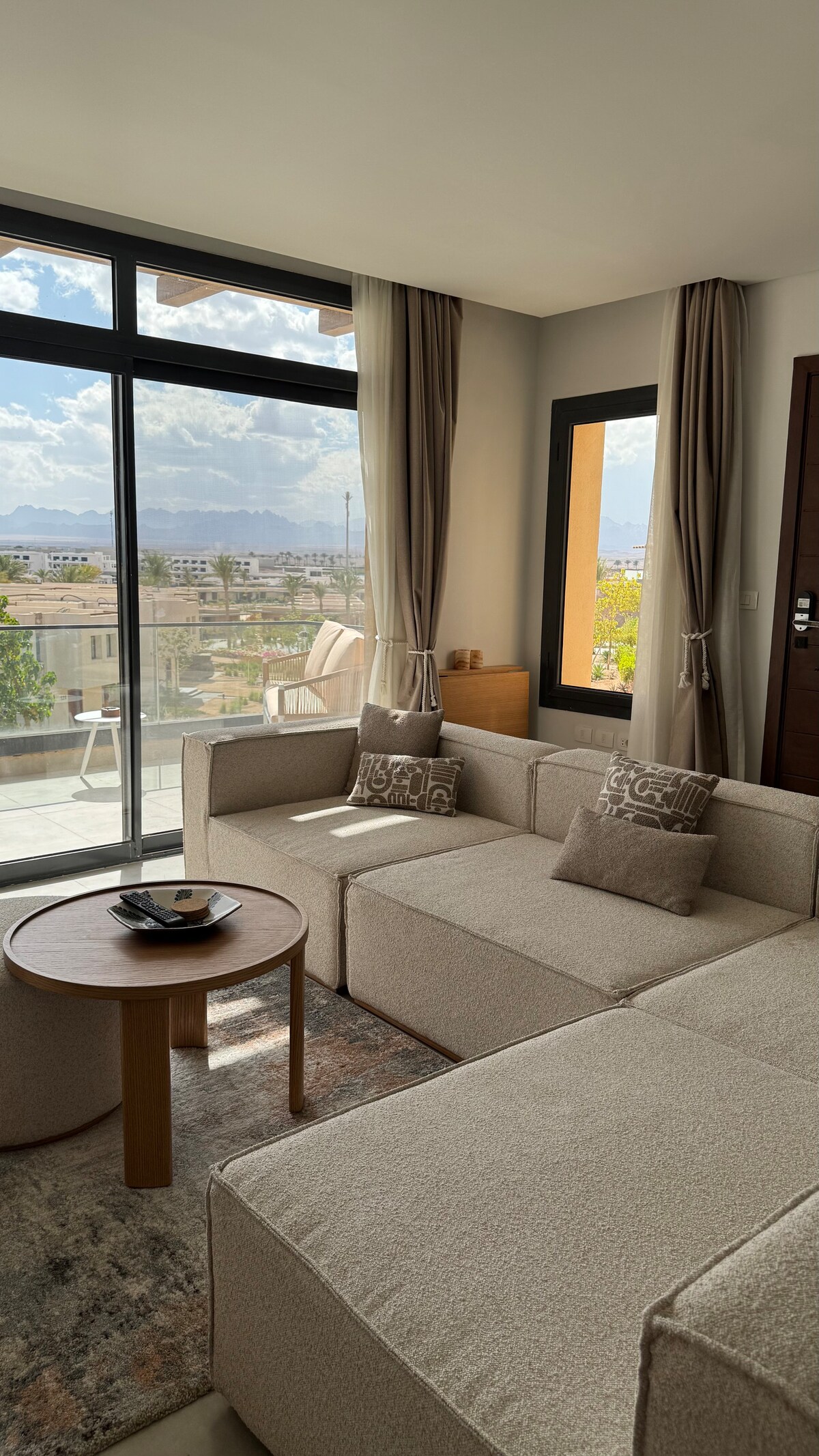 Apartamento moderno de estilo europeo con vistas al mar y a las montañas Todos los muebles están hechos a mano localmente. En la amplia terraza, puedes relajarte en las tumbonas y disfrutar de la vista panorámica del mar. El gran dormitorio con fantásticas vistas a las majestuosas montañas desérticas de Safaga ofrece mucho espacio y tranquilidad. La cocina está equipada con electrodomésticos de alta calidad. El espacioso salón con sofá cama extraíble también ofrece vistas al mar.
