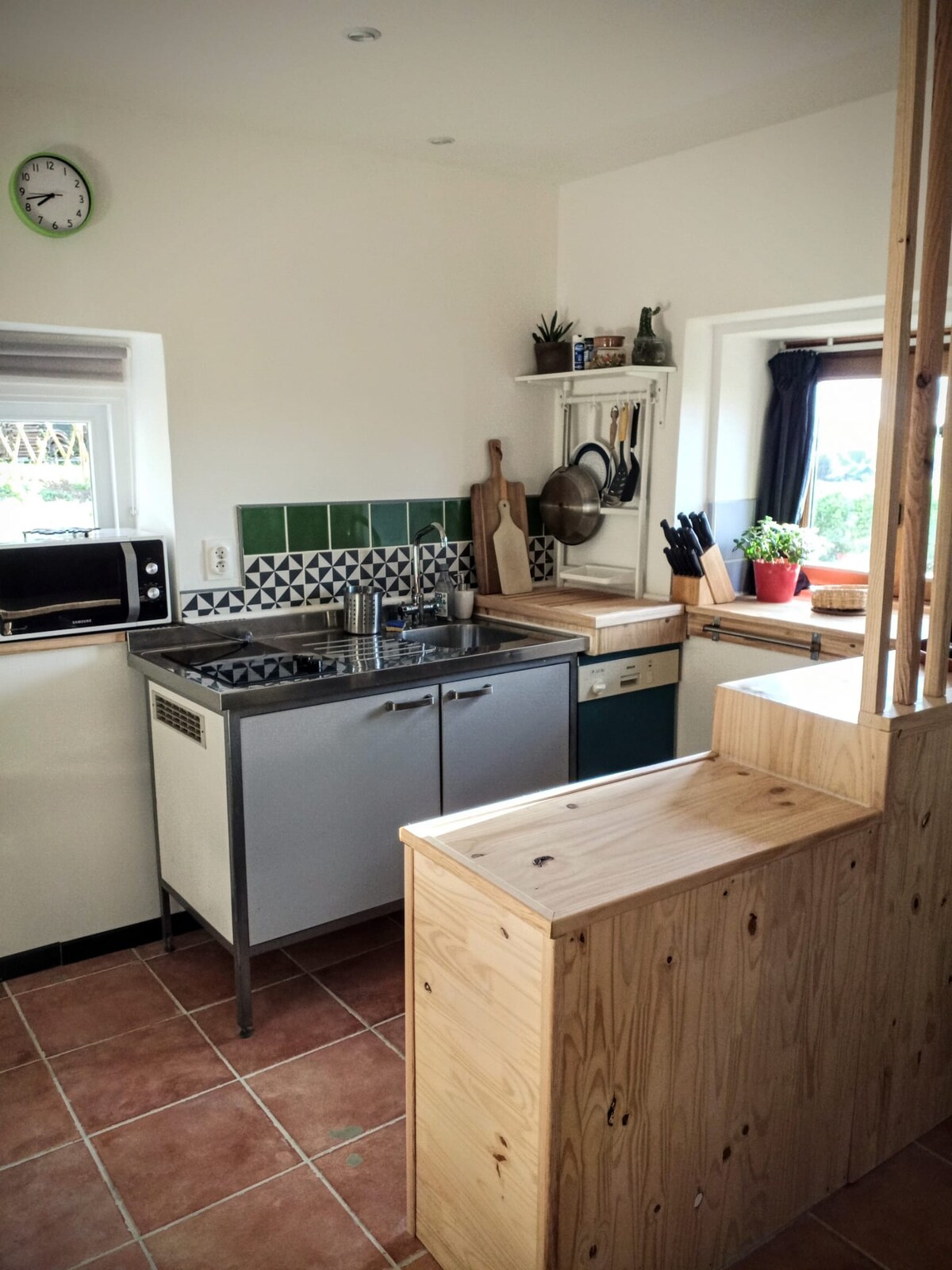 Casa 90m2 Cocina equipada: nevera, horno, microondas, placa de cocción, cafetera, hervidor de agua, tostadora, lavavajillas, lavadora. Sofá, escritorio, TV, wifi WC Planta: dormitorio con cama de 160 y 90, armario y cómoda, dormitorio con cama de 140 y 90, armario y cómoda. Cuarto de baño con lavabo, cabina de ducha, secador de toallas WC separado. En el exterior local cerrado con llave para bicicleta con toldo. Parrilla, tumbona Patio con cenador, zona de césped todo completamente vallado, aparcamiento privado