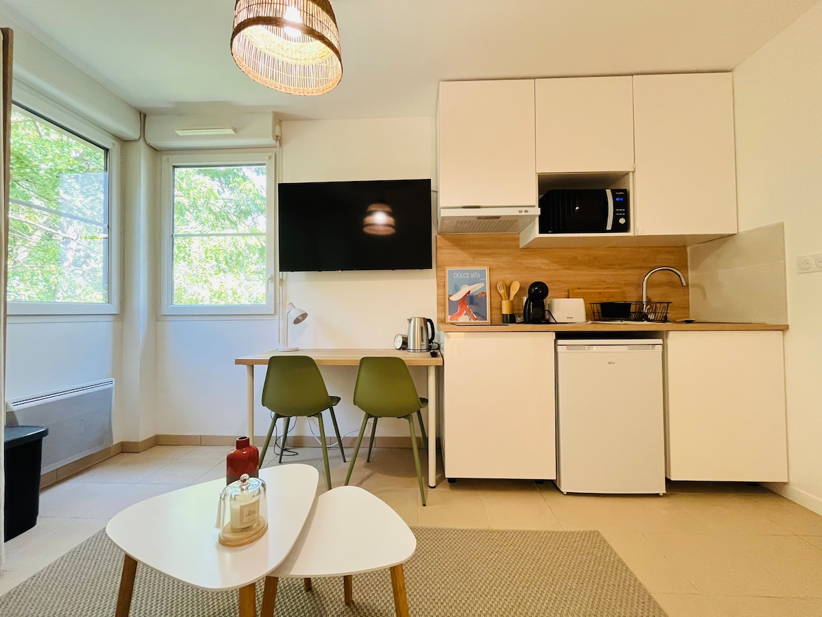 🌿 Paréntesis bucólico a las puertas de Toulouse 🌅 El Estudio oculto de Margotte es un nido tranquilo y luminoso, detrás de nuestra casa, con unas vistas increíbles a los campos. Desde la terraza, disfrute de mágicas puestas de sol en las alturas de Toulouse🌅. 📍 Situado en un callejón sin salida protegido por una barrera cerca de la terminal de metro Balma-Gramont, en un entorno verde, tranquilo y con una piscina (compartida, no privada)