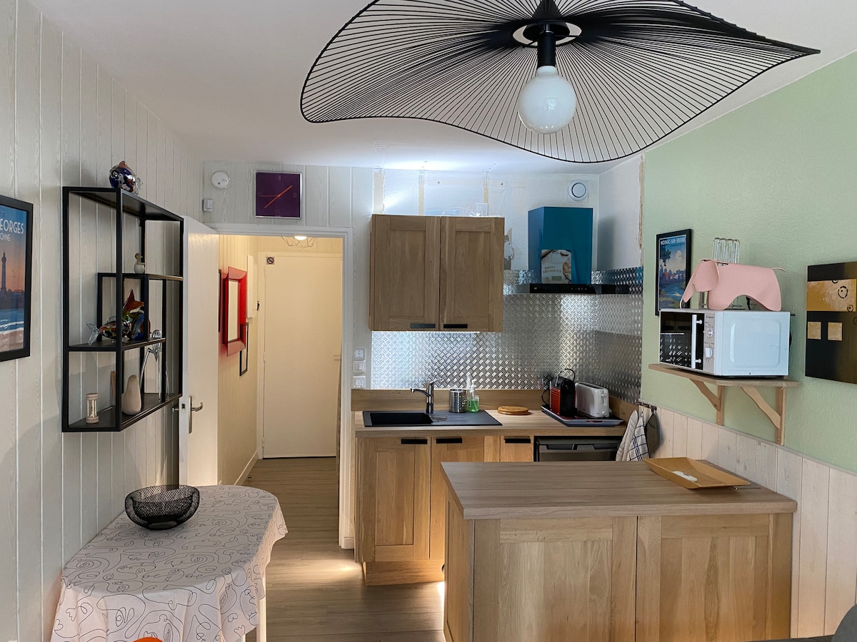 Ofrezco este apartamento independiente de 2 habitaciones, de una sola planta en la planta baja de la casa, que consta de 1 dormitorio con cama para dos personas (140), 1 sofá cama (colchón Bultex) en la sala de estar El apartamento está totalmente equipado, TV,Cocina equipada,Wifi,Lavadora... idealmente situado entre el centro de la ciudad (200 m), la playa de Saint Georges de Didonne (500 m) y a 800 m de la playa de Royan. También tiene acceso a una terraza privada con flores y barbacoa. Nuestros amigos los animales son bienvenidos :)