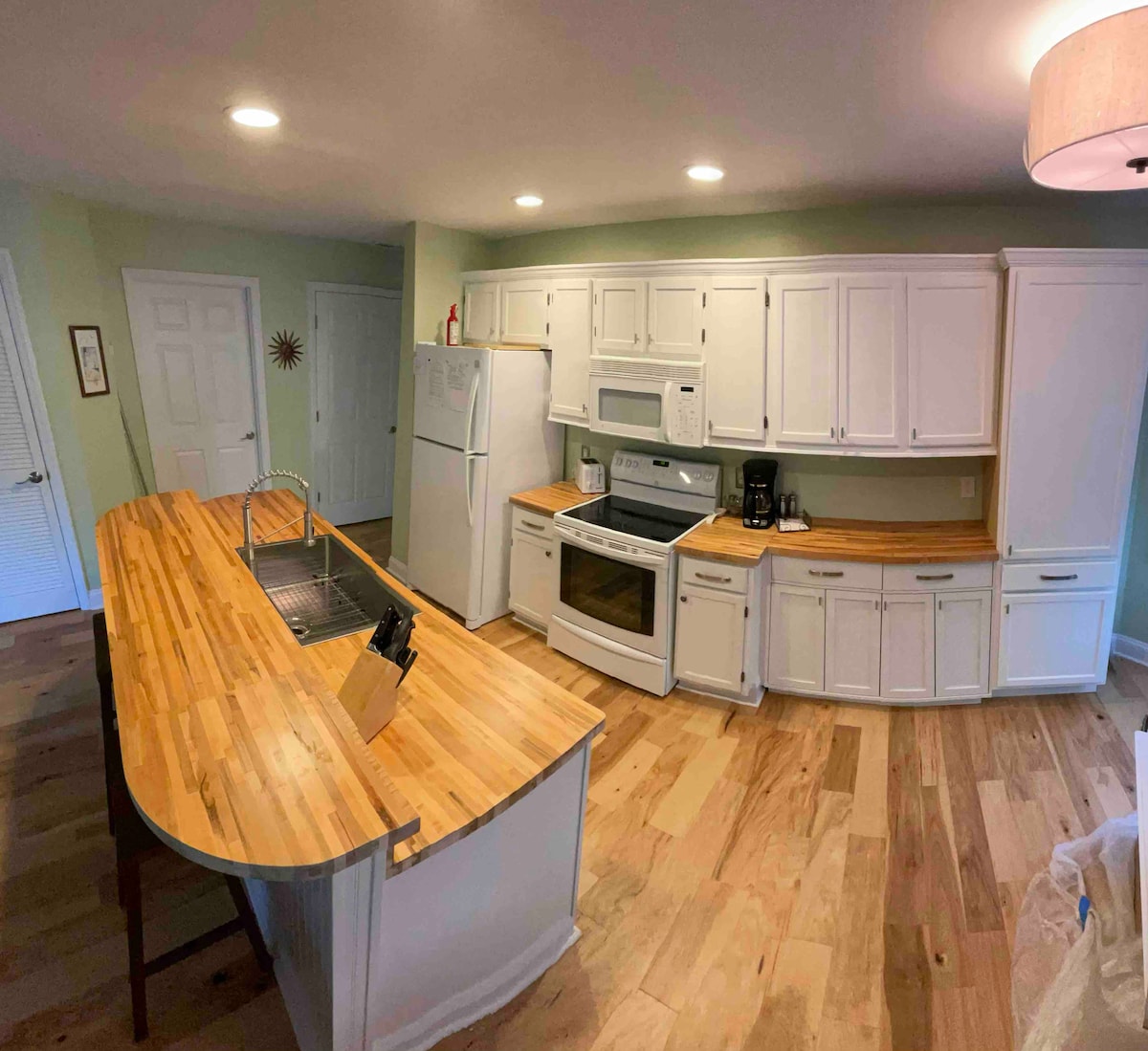 Suite de dormitorio principal renovada con paredes shiplap, bañera de hidromasaje e inodoro con bidé. Muy parecido a un spa y perfecto para solteros o parejas que quieren escapar. A poca distancia de la playa, del mercado de agricultores y de conciertos al aire libre. A poca distancia a pie de restaurantes. Tu habitación tiene su propia entrada en el segundo piso. ¡Gran porche protegido también tuyo para disfrutar! Tenemos Roku TV. Muebles de dormitorio nuevos y colchón con cama ajustable. No está preparado para la seguridad de los niños.