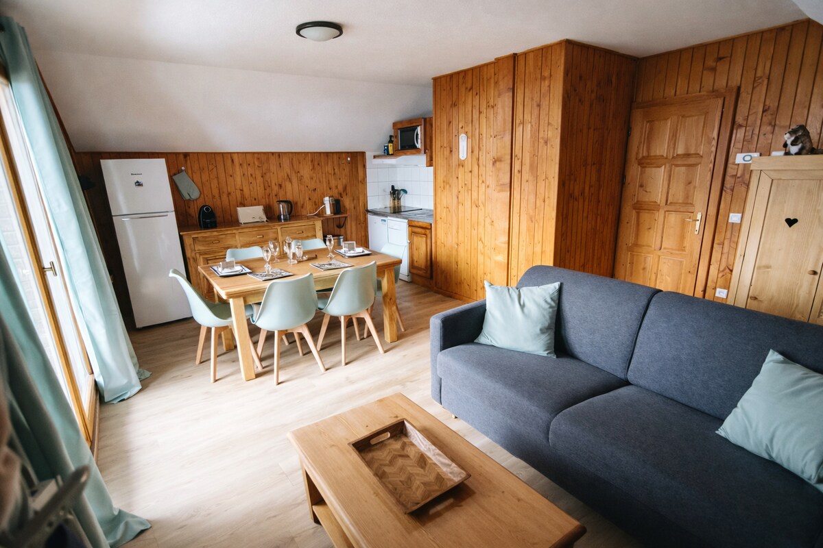 Nuestro apartamento en la montaña es un verdadero sueño familiar, que ofrece dos habitaciones totalmente renovadas y una cocina totalmente equipada y una agradable sala de estar. Tiene acceso a la piscina al aire libre, sauna y baño turco (en temporada julio agosto y mediados de diciembre a mediados de abril) Ubicado en un pintoresco entorno montañoso y situado en el centro del dominio de las Sybelles a 1,5 km de las pistas de esquí. Se encuentra al pie del puerto de la cruz de hierro para los amantes del ciclismo