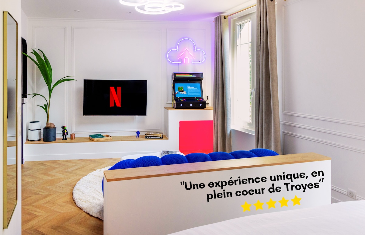 ¡The Cloud, suite de lujo en el corazón de Troyes! Disfrute de una noche atemporal en una burbuja de confort, diseño y sensaciones. - Cama King Size 5* para flotar como Son Goku en su nube - Ducha sensorial para dos - Máquina recreativa con 8000 juegos - Cine 4K inmersivo, ¡incluso durante el día! - Columpio suspendido con vistas a los árboles - Sofá Nuage realzado por una aurora boreal LED Reserva tu escapada celestial y déjate llevar por las nubes