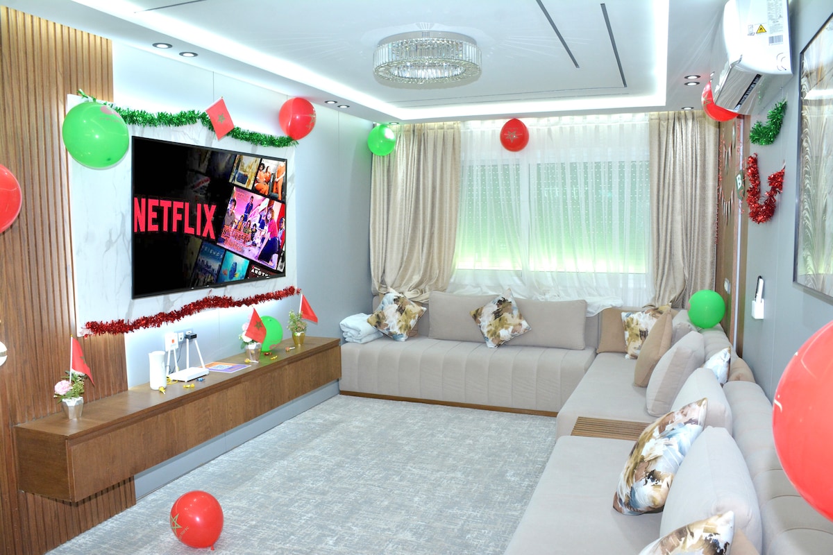 Alójese en Fez en un apartamento moderno, luminoso y refinado, situado en una zona tranquila, segura y cerca de todos los servicios. El apartamento consta de 3 cómodos dormitorios, un amplio salón con wifi de alta velocidad, 2 televisores equipados con IPTV, una moderna cocina totalmente equipada, un balcón y 2 aires acondicionados para su comodidad. 🚘 También hay aparcamiento gratuito disponible. 📍 Cerca del CHU Fez, el supermercado Marjane, el estadio, el centro de la ciudad, restaurantes, cafeterías