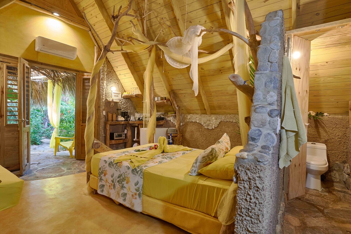 This cozy Caribbean Cabin lies within a jungle of palm trees with a fantastic view of the Sea. There is also a breathtaking vista of Mountains to the East. It is designed for a one of a kind get away back to Nature! This, off the grid ecological space in Paradise, has solar powered electricity with a pure water supply fed by a natural springs on the land! It is a 10 minute drive to incredibly beautiful beaches. Also, 25 minutes away, exists the well known Sea town of “Las Terrenas”