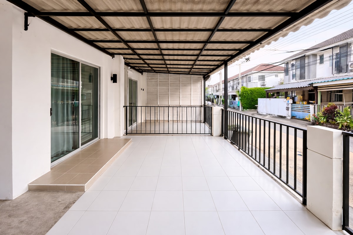 Bienvenido a nuestra acogedora casa adosada de 89 metros cuadrados de esquina con espacio habitable de 200 metros cuadrados. Esta pequeña casa cuenta con 2 dormitorios con baño privado, gran espacio familiar y aparcamiento y jardín privados. La ubicación es conveniente para todos los accesos, ya que se encuentra detrás de Mega Bangna. La ubicación también es accesible a la estación de tren Bearing o Udomsuk Sky, al Centro Internacional de Comercio y Exposiciones de Bangkok (BITEC), al aeropuerto de Suvarnaphumi, etc.