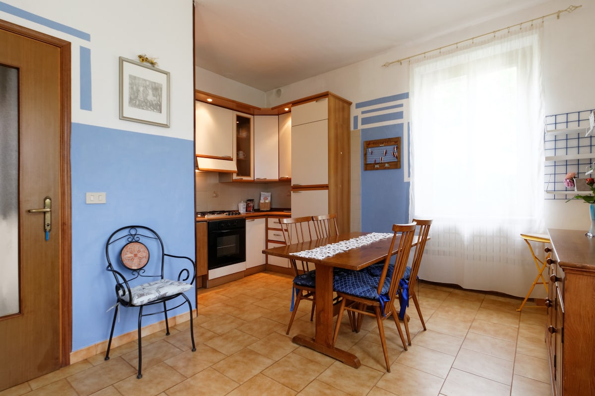Incantevole casa indipendente, situata su una bella collina con vista panoramica sulla valle. La privacy è totale! Il portico in castagno e l'ampio pratone circostante godono di sole tutto il giorno. La casa tutta in legno e su due piani ha un’atmosfera calda e accogliente. La cucina tipica con volta in mattoni ed un piccolo camino. Il soggiorno con il grande tavolo da pranzo ed un salotto con tv e biblioteca. Al primo piano, un bagno completo e tre camere con meravigliosa vista alla valle.