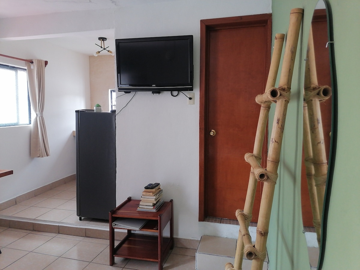Excelente ubicación, a 5 minutos caminando de la terminal de autobuses ADO/OCC y autobuses locales, a 10 minutos del centro de San Cristobal. Un estudio chico para 2 personas con cocina, baño privado, Tv Netflix, agua caliente :) En el exterior tenemos mesa y sillas para que puedas tomar tus alimentos, leer, ademas de área de lavado a mano que se comparte con el departamento de al lado. Estarás alojado en un barrio típico seguro y tranquilo, rodeado de gente local