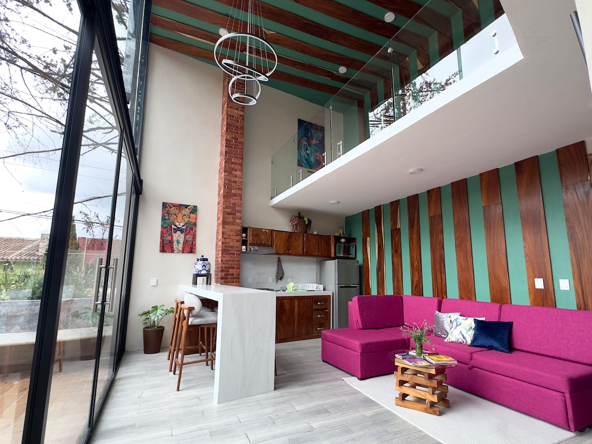 Loft con espíritu audaz y estilo contemporáneo, que permite entrar en contacto con la naturaleza y disfrutar de la tranquilidad del bosque. Al interior de una privada con portón eléctrico, a 8km del Centro Histórico. Ideal parar un fin de semana con familia y amigos, con capacidad para 8 personas.