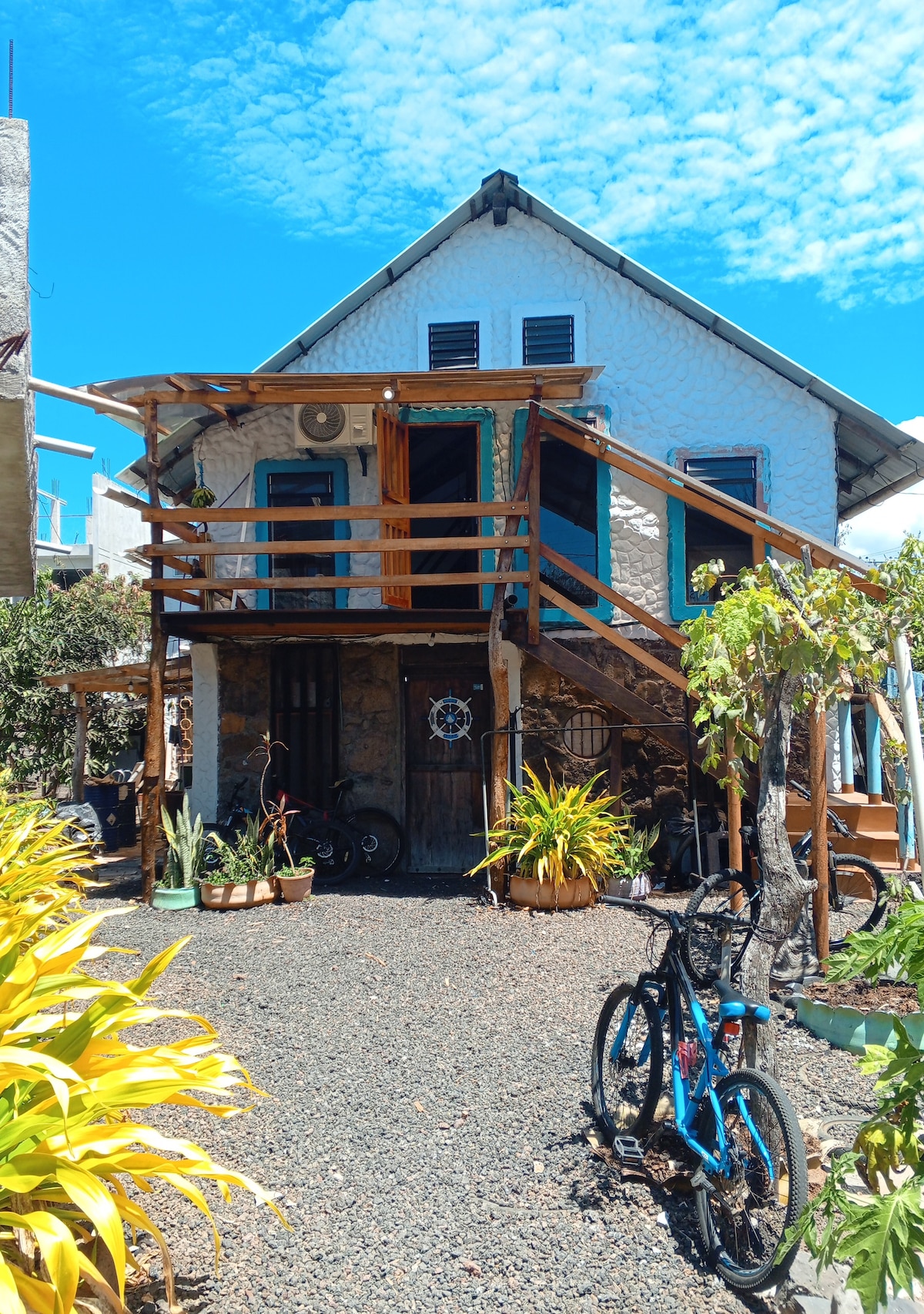 Suite en ubicación privilegiada a 7 minutos caminando del muelle Baquerizo Moreno, en barrio dentro del centro poblado de la isla San Cristóbal. Para turistas que buscan sentirse en casa, con todas las comodidades para estadías largas. Moderna, luminosa con ventanales, amplia, privada y fresca, con aire acondicionado y ventiladores de techo y 3 baños completos privados (por c/habitación), terrazas exteriores techadas, hamacas, wifi, lavadora, secadora, incluye garrafón de agua para consumo y más
