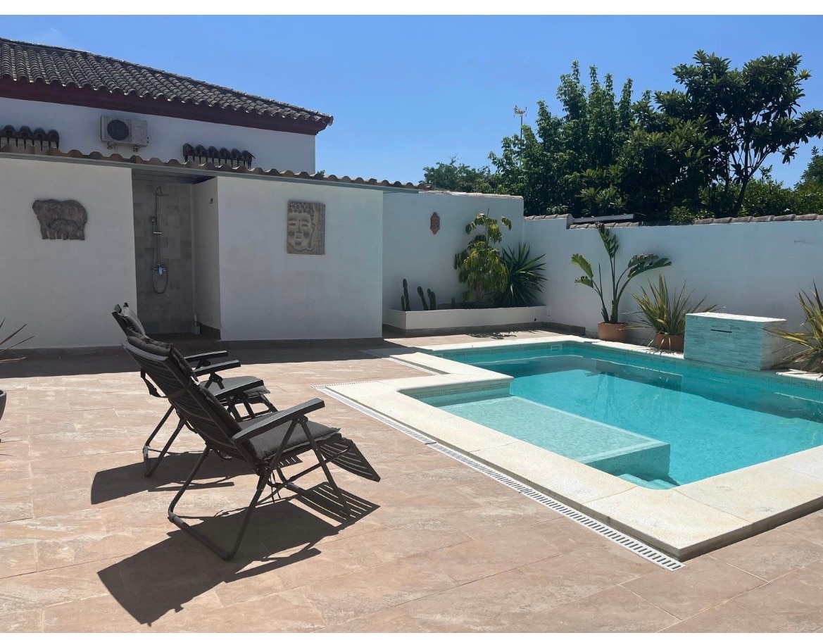 Villa de lujo en Chiclana de la Frontera, a minutos de las playas de Cádiz. Piscina privada, jardín con palmeras, calefacción radiante y construcción moderna de alto standing. Capacidad para 6 personas: 2 dormitorios con baños en suite, sofá cama, cocina equipada, WiFi, aire acondicionado, BBQ y parking gratuito. Privacidad total en plena naturaleza.