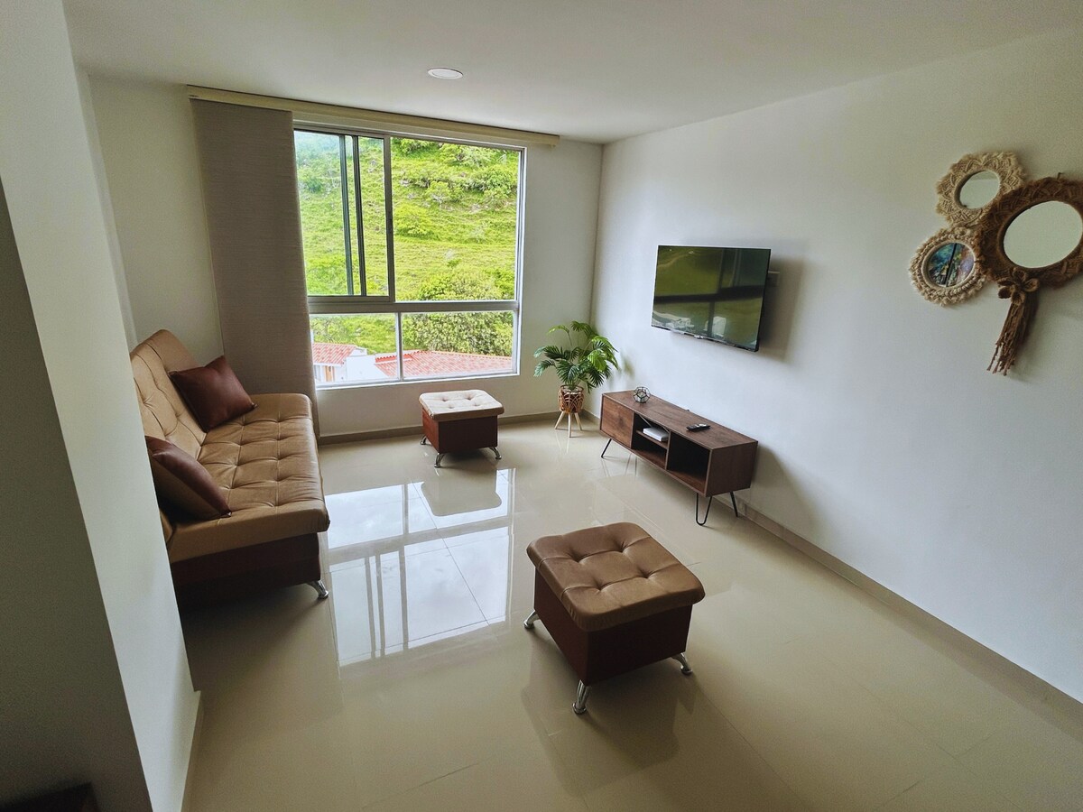¡Bienvenidos a su hogar en San Gil! Este encantador apartamento lo tiene todo para una estancia inolvidable, cocina equipada, un acogedor espacio con sofá cama, hamaca y televisor para relajarse después de un día de aventuras. La habitación principal cuenta con una cómoda cama doble, baño privado, closet y un balcón con la mejor vista de la ciudad. Además, los huéspedes pueden disfrutar de las comodidades del conjunto, como la piscina, sauna, turco, cancha múltiple parque infantil y Parqueadero