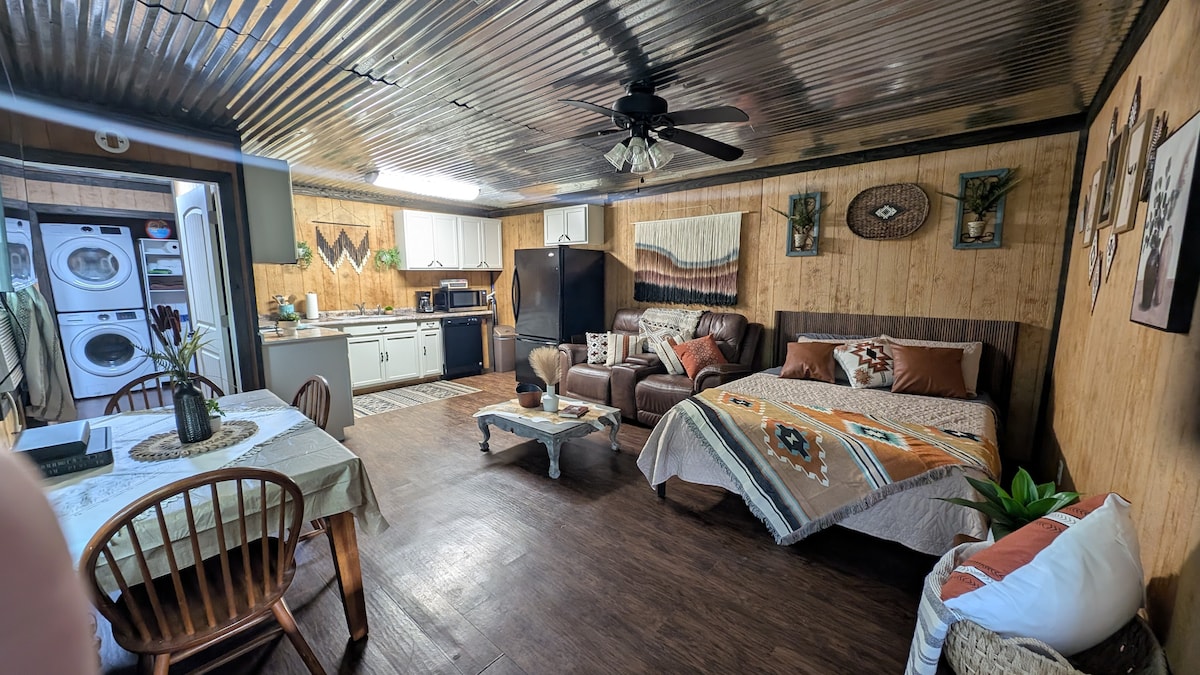 ¡¡¡Sin gastos de limpieza!!! Casa rural privada de 32 m² en una finca compartida de 0,5 hectáreas con su propia entrada y un patio lateral privado con fogata. El techo abovedado le da una sensación abierta, estilo villa. A poca distancia de las tiendas y restaurantes del centro de Livingston. Limpio, sencillo y cuidadosamente preparado, ideal para personas que viajan solas o en pareja y que prefieren el encanto al lujo. La familia vive en el alojamiento principal. Es posible que escuches actividad normal y que nuestro border collie Loki te salude.