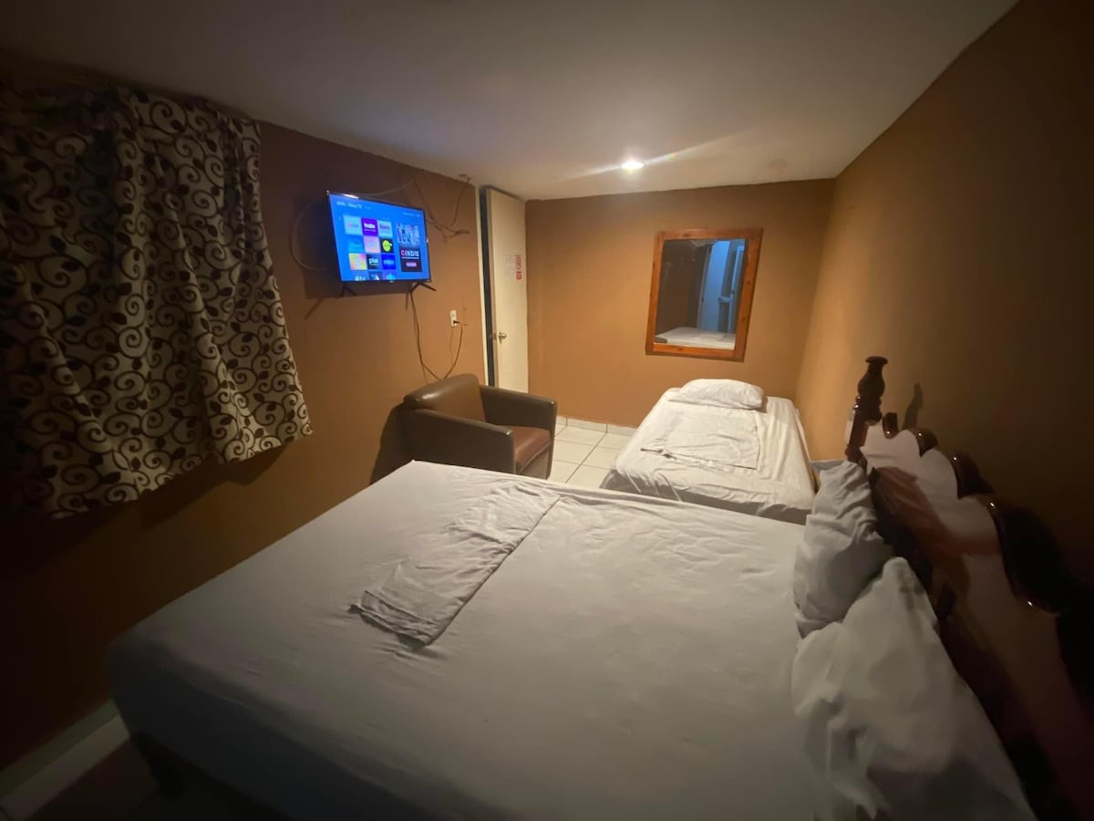 Recámara muy amplia, anexa a la casa principal, con aire acondicionado, wifi, televisión con cable, 2 camas matrimoniales y una litera, baño con agua caliente, entrada independiente, estacionamiento para un auto, zona céntrica, cerca de terminal de autobuses, bancos, centros comerciales. Nota: de acuerdo a necesidades se puede agregar un sofá cama, una cuna, un colchón en el suelo o colchonetas.