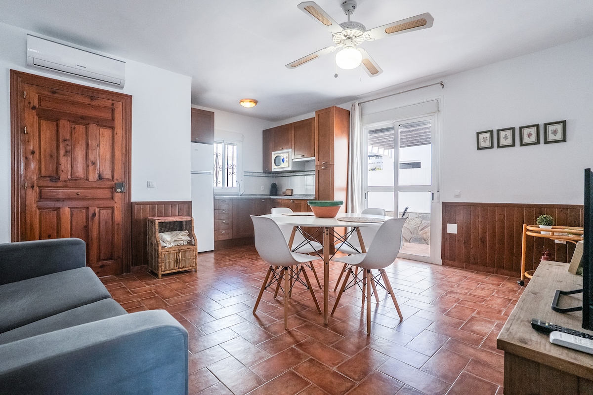 Precioso apartamento de diseño con salida a zona ajardinada y vistas al mar. Dispone de cocina completa con lavavajillas, cafetera Nespresso y todos los utensilios necesarios para una estancia cómoda. Dormitorio con armario empotrado. Parquet en las zonas nobles. Aire acondicionado en todas las estancias. Wifi. Está ubicado a escasos metros de la playa de Las Negras. Salida a terraza con zona Chill out. No se admiten mascotas.