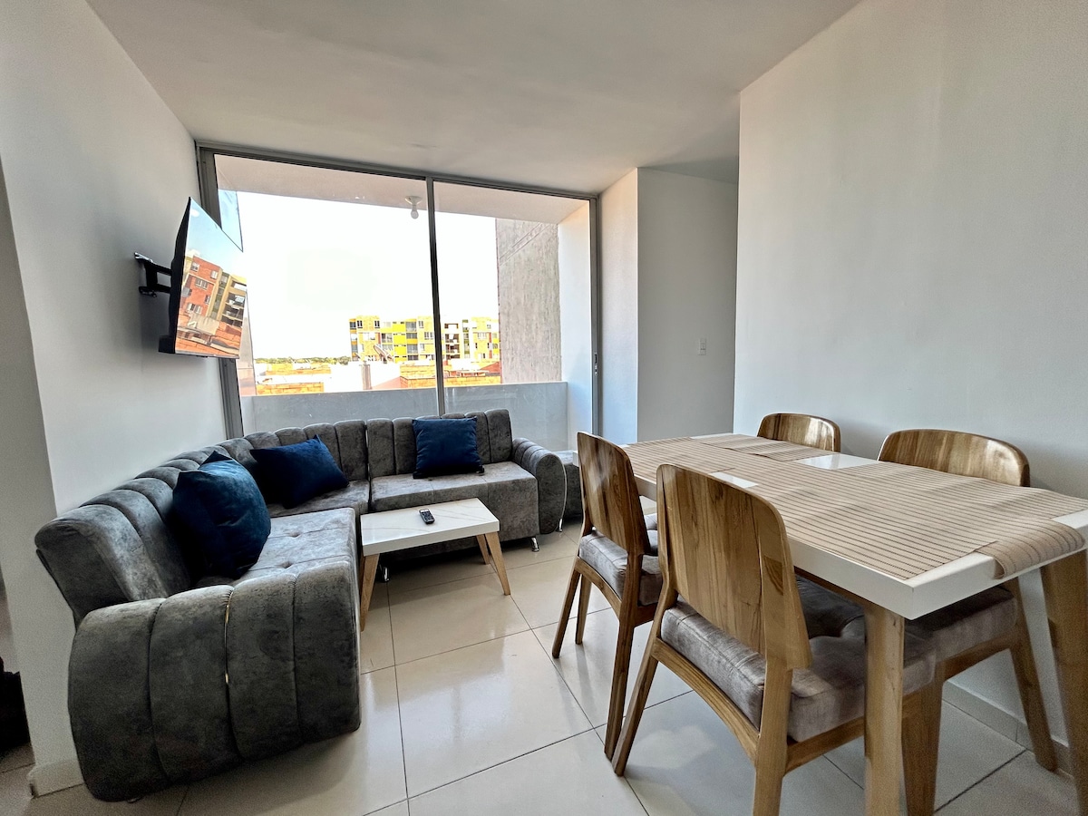 Apartamento moderno y confortable con 2 habitaciones: principal con cama doble, aire acondicionado y TV, y secundaria con camarote. Dispone de sala con pantalla gigante y balcón, cocina equipada, baño elegante y espacio para estudio. Con WiFi, ventiladores y excelente ubicación cerca de transporte, supermercados y restaurantes. Ideal para familias, parejas o viajes de trabajo.