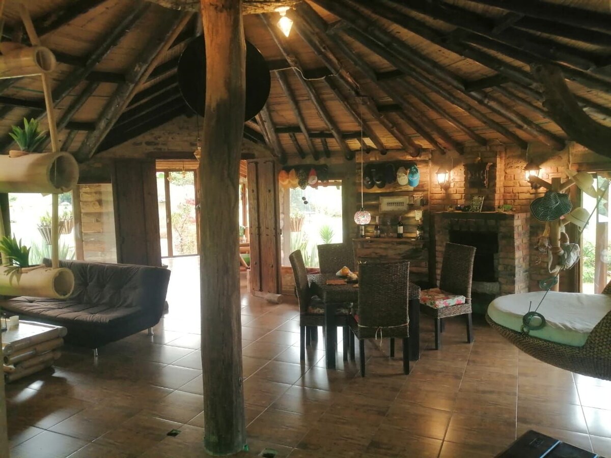Casa ideal para familias, amigos o parejas. Cuenta con 3 habitaciones (principal con chimenea y baño privado), cómodas camas dobles y sencillas; 2 baños; cocina equipada con nevera, horno y estufa; sala con dos chimeneas y sofás cómodos; terraza con vista a montañas; parqueadero seguro; zonas verdes, cancha de fútbol, casa de muñecas, BBQ, hamacas y juegos de mesa. Perfecta para desconectarse y disfrutar de senderismo, ciclismo y más en un entorno seguro y natural.