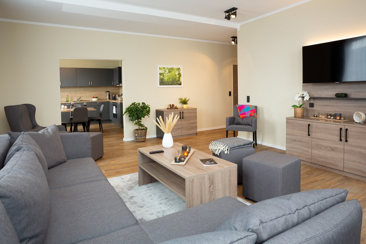 Nuestro apartamento tiene aproximadamente 70 m² de superficie habitable dividida en 3 habitaciones, pasillo y baño, un tamaño estupendo para 4 a 6 personas. La sala de estar (comedor, sofá/zona de televisión y cocina) está amueblada con cariño y es acogedora. El dormitorio con cama doble de 1,8 x 2 metros es muy amplio y tiene un acceso independiente, al igual que la sala de estar, al gran balcón orientado al sur (18 m²). Nuestro dormitorio está equipado con una cama de 3 pisos de alta calidad. Sauna privada para sentirse bien.