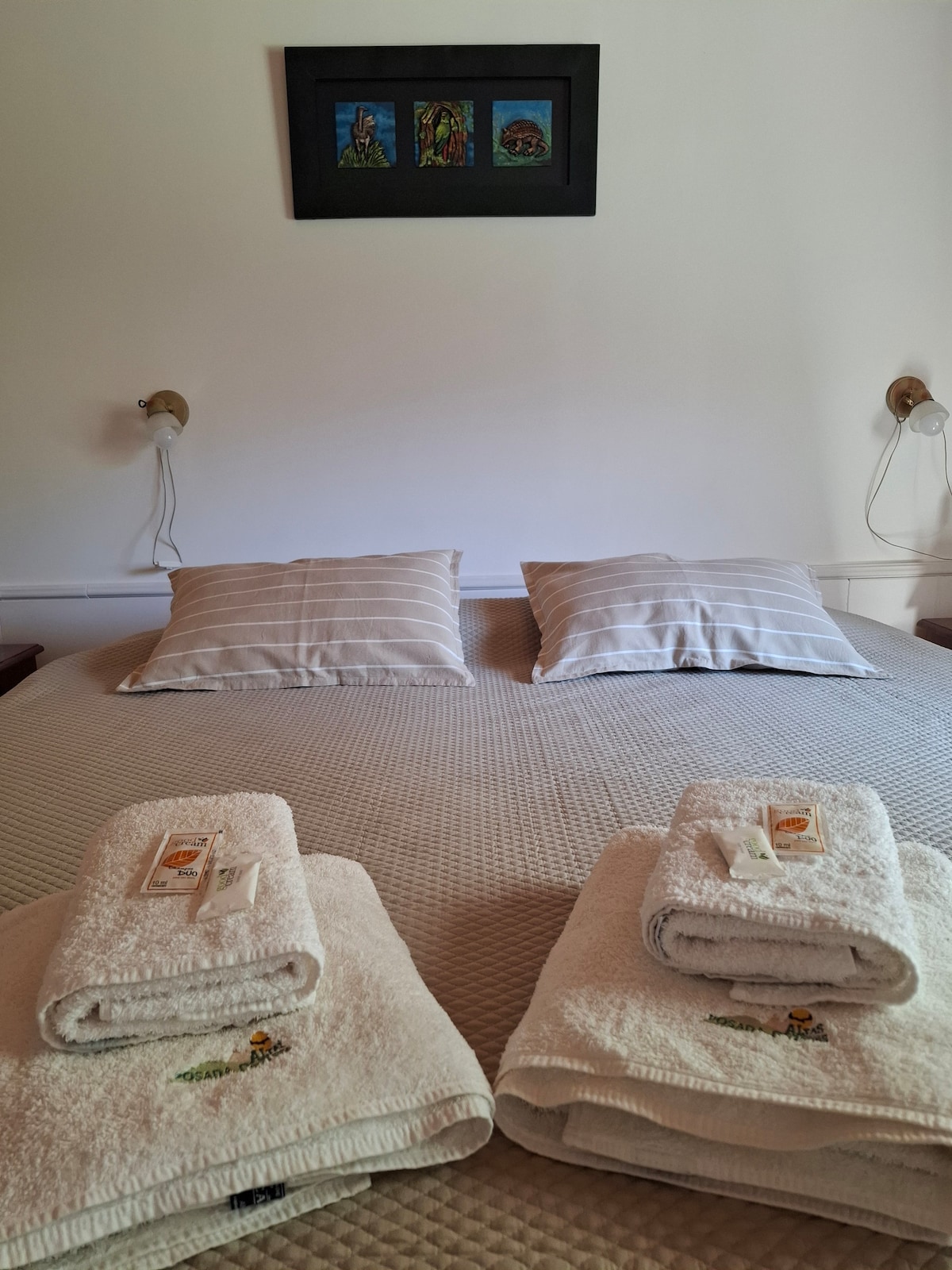 Se trata de una habitación en planta alta, con baño privado y acceso independiente a través de escaleras exteriores. Ideal para quienes viajan solos o en pareja. La habitación cuenta con frigobar, pava eléctrica, cubiertos, y elementos para preparar el desayuno. También les dejamos un set platos de madera, cuchilla y ensaladera por si quisieran utilizar alguno de los “chulengos” o barbacoas que se encuentran en el parque del predio.