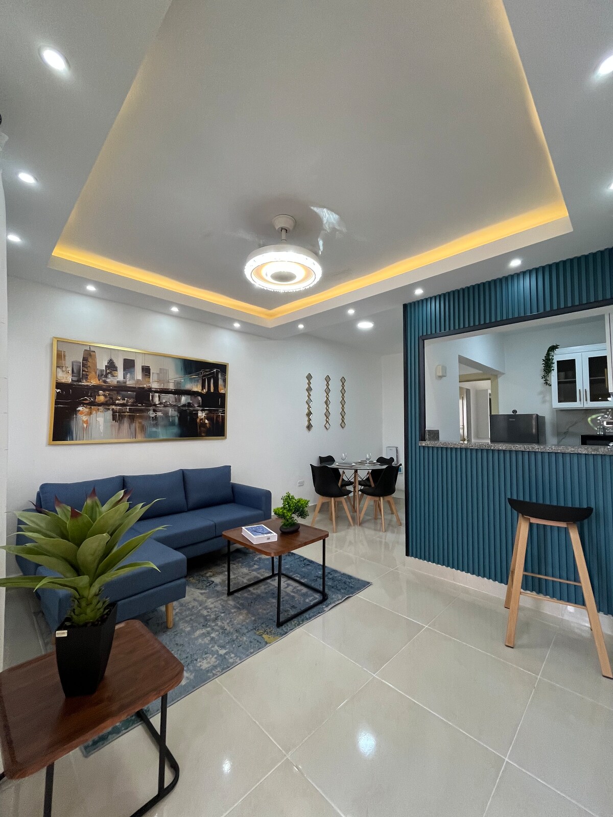 El apartamento esta ubicado en sector exclusivo, En un proyecto cerrado con seguridad 24 horas, con una estructura moderna,bien iluminado amueblado,con luz 24/7. Le incluye una terraza de 151 Mts totalmente amueblada en bambú con mesa de billar, Jacuzzi, bar (Sin bebida incluida) y terraza destechada si desea solearse,wifi,Tv Led con canales premium. Estamos ubicado cerca de los principales centros comerciales como Blue mall (2 M),agora mall (3 M),Silver sun (2M). Con Caja de seguridad incluida.