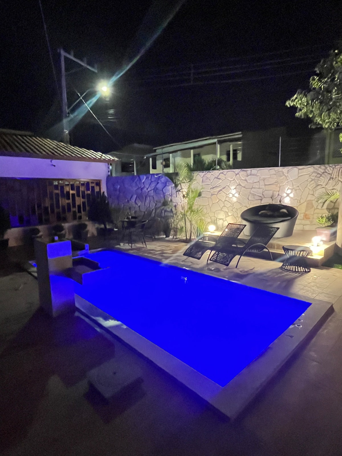 Equipada com piscina, sala de jogos com mesa de bilhar e carteado, edícula com duas suítes e área de serviço com máquina de lavar. No quiosque, há uma mesa de jaqueira de 3m, banheiro, além de churrasqueira, fogão elétrico, geladeira, cervejeira, bem como copos, taças, pratos e talheres. Área da piscina com espreguiçadeiras, mesa, cadeiras e chaise, além de uma cascata deliciosa. Tenha dias incríveis! A casa principal não está incluída no anúncio, sendo vedado o acesso.