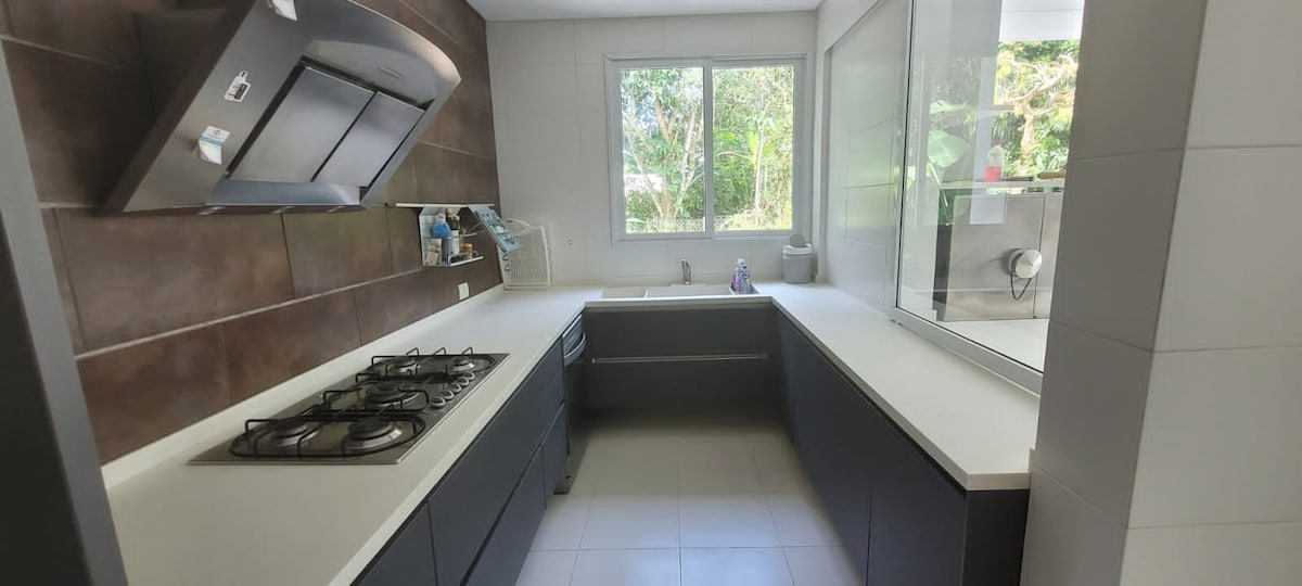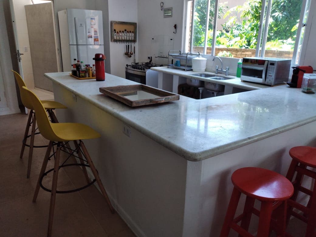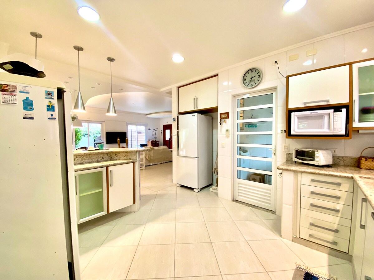 Casa dois andares com infraestrutura completa, apenas 2 minutos a pé da praia. 4 suites com ar condicionado( Uma no térreo ), wi-fi 500mg , Smartv,. Área externa contemplando piscina, Jacuzzi ,churrasqueira, forno de pizza, forno a lenha e mesa ao redor da natureza, redes, lareira na sala, caiaques. Condomínio seguro com reconhecimento facial, rondas 24hs, praia tranquila e vazia, rios. Cozinha completa,2 geladeiras com freezer, freezer na dispensa,máquina de lavar roupa, quartinho.