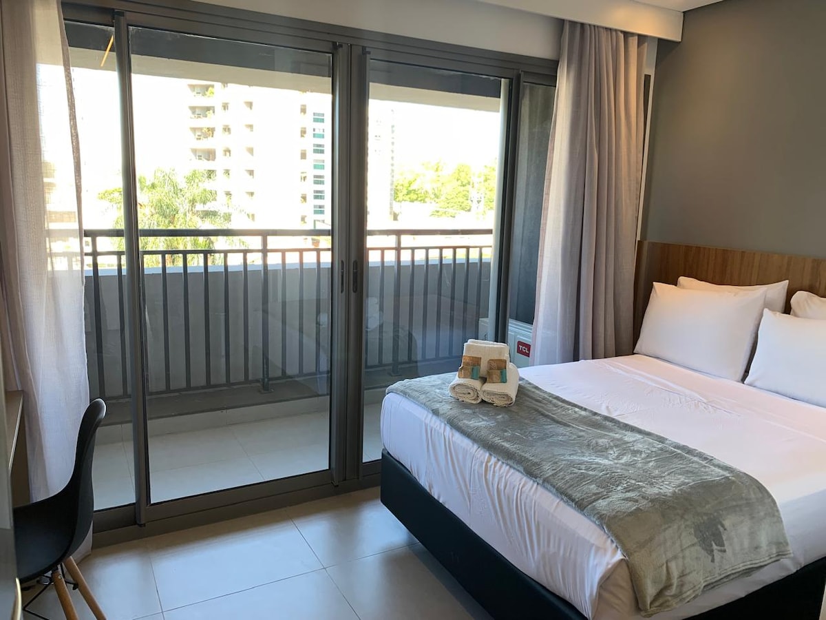 Estudio equipado con vistas (22 m2 - 5ª planta). Apto está al lado de la estación de Metro Brooklin y a 12 minutos en coche del aeropuerto de Congonhas. >> Lugares cercanos: . Hípica Paulista . Clínica Einstein . Consulado americano >> Centros comerciales cercanos: Centro Comercial Morumbi . Compras D&D . Compras en Ibirapuera . Compra JK Iguatemi >> Tendrás en el apartamento: Recepción 24/7; . Gym; . Lavandería OMO; . Coworking;