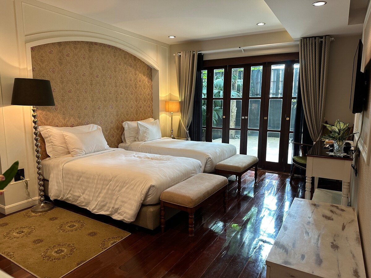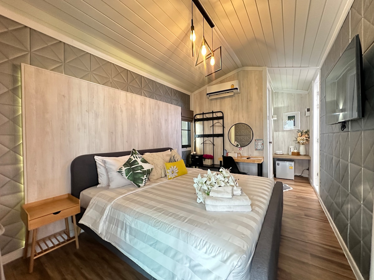Luxury room for 2 persons with double bed in private garden made you have relax surrounding by nature. Large swimming pool, private party at swimming pool (please request) Service: breakfast 2 person, coffee cafe, swimming pool, security, reception, wifi, working space Location: in Vieng Kum Kam 5 min to 89 plaza market: fresh market, Top supermarket 10 min to Chiangmai Airport 15 min to Central Festival 15 min to Old City *we have motor bike for rent price start from 350 baht*