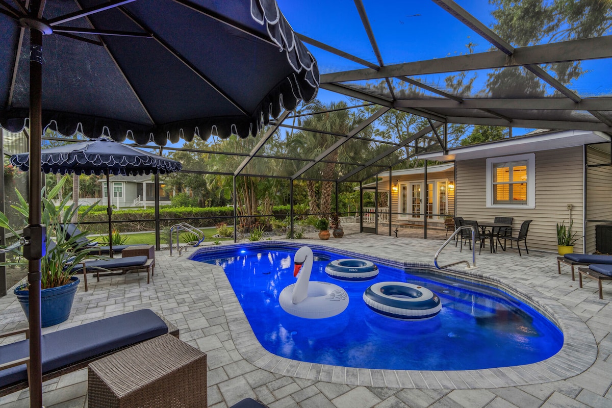 ¡Diversión para toda la familia! ¡A solo 1 milla de la playa! Esta casa recientemente renovada viene totalmente amueblada con 4 dormitorios y 3 baños. Con un total de 6 camas, el alojamiento tiene capacidad para 10 personas cómodamente. La piscina climatizada es perfecta para nadar, y al estar a solo 1 milla del mundialmente famoso Siesta Key Beach Access 12, esta casa también hace que la playa sea fácil y cómoda. En el interior, la casa está limpia, espaciosa y recién actualizada y equipada con televisores inteligentes, mesa de hockey de aire, futbolín de billar, Pac-Man, diversión para todos